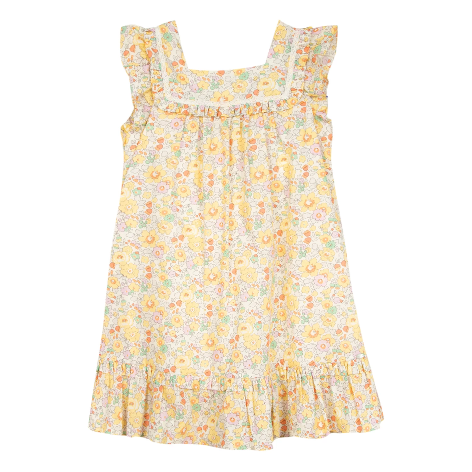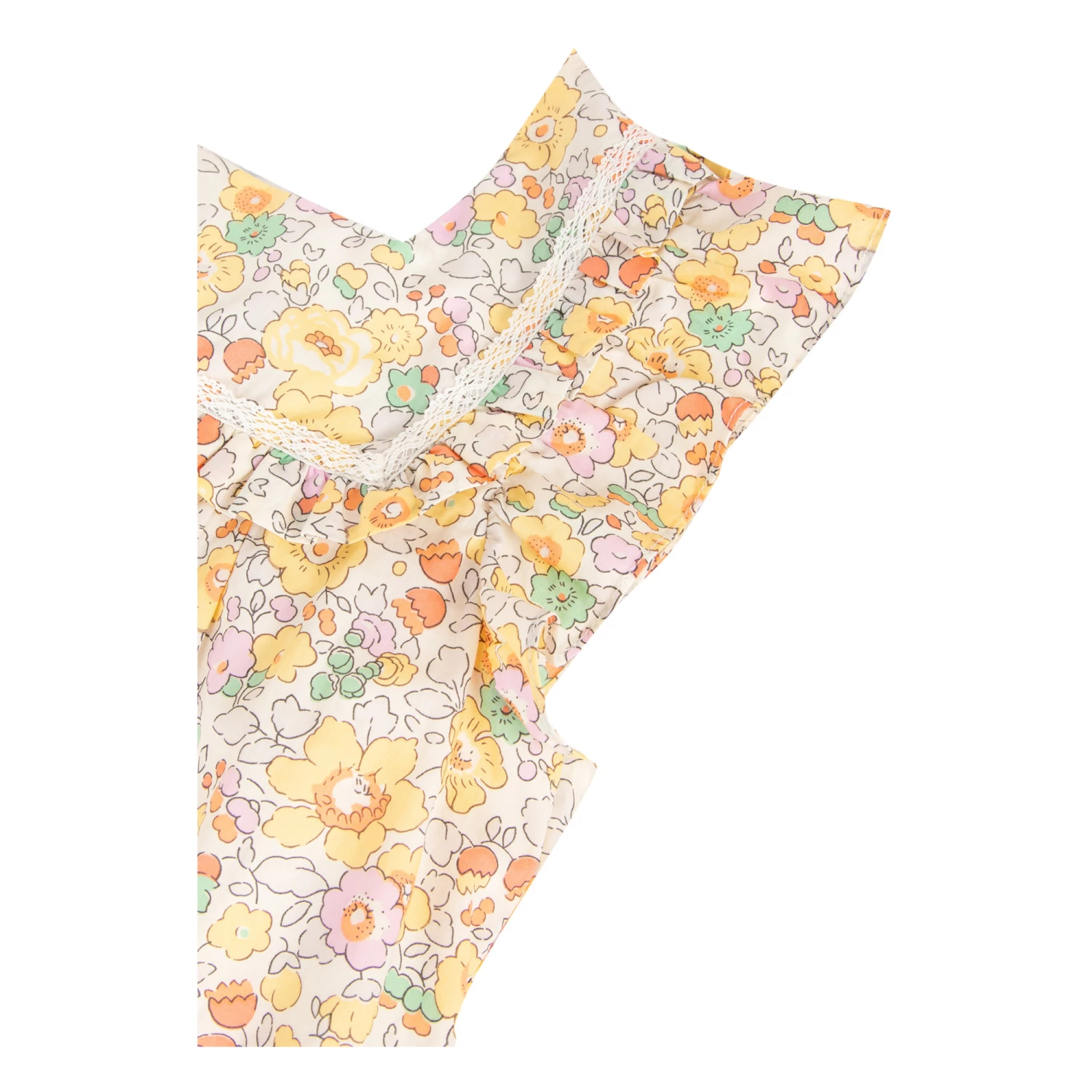 - Flounce sleeve, Gathered detail, Lace details, Frilled yoke, Short sleeves