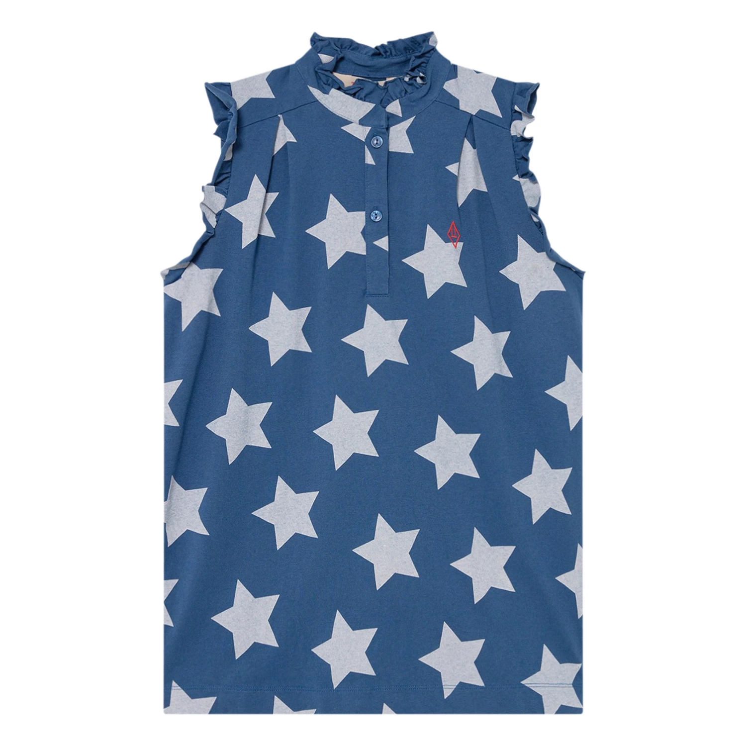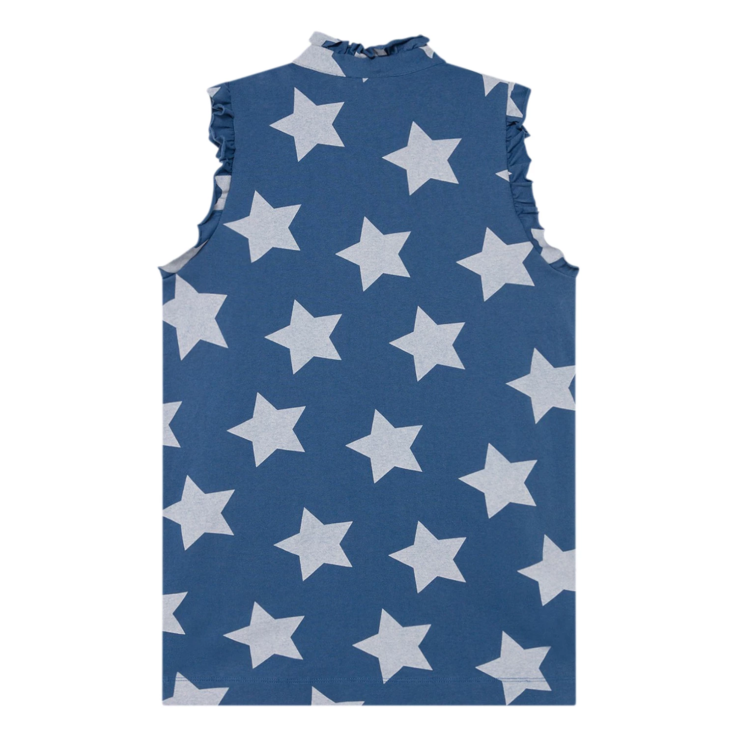 - Gathered armholes, Embroidered logo, Sleeveless, Buttoned collar, Gathered collar, Turtleneck