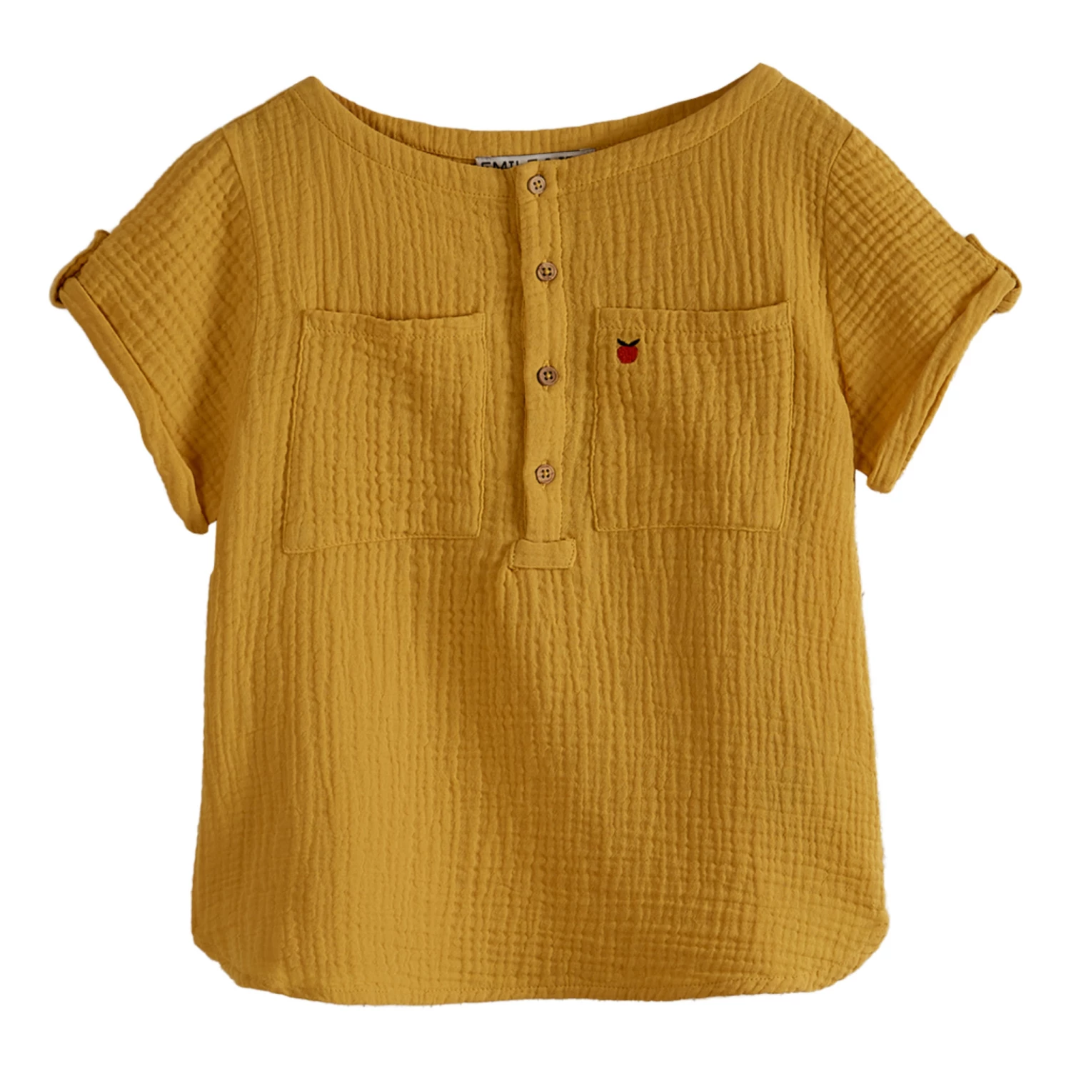 - Cuffed sleeves, Crew neck, Top stitched, Flowy, Short sleeves, Inverted pleats, Breast pocket(s), Embroidery