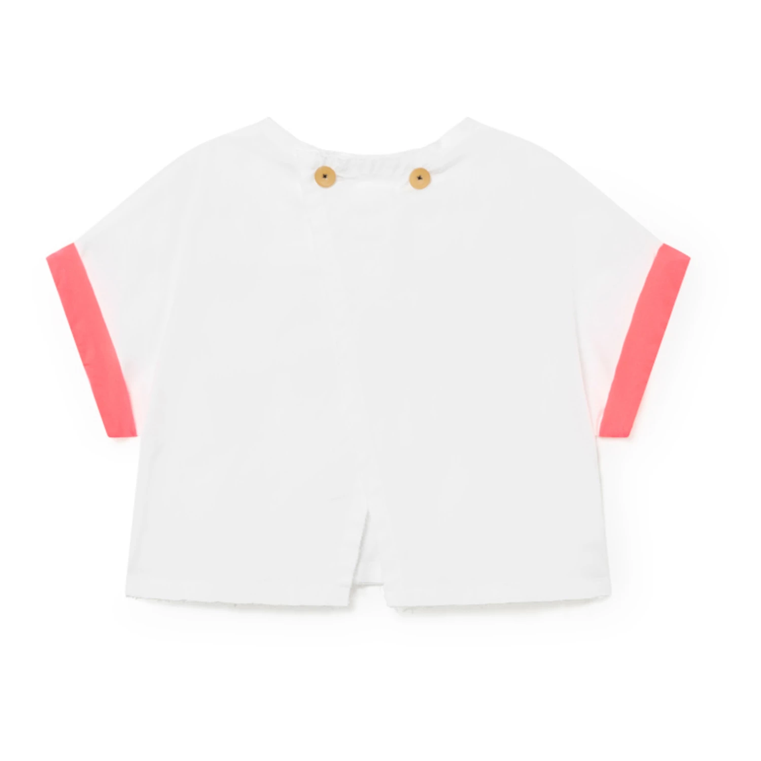 - Lined, Crew neck, Slit back, Flowy, Short sleeves, Top stitched edges