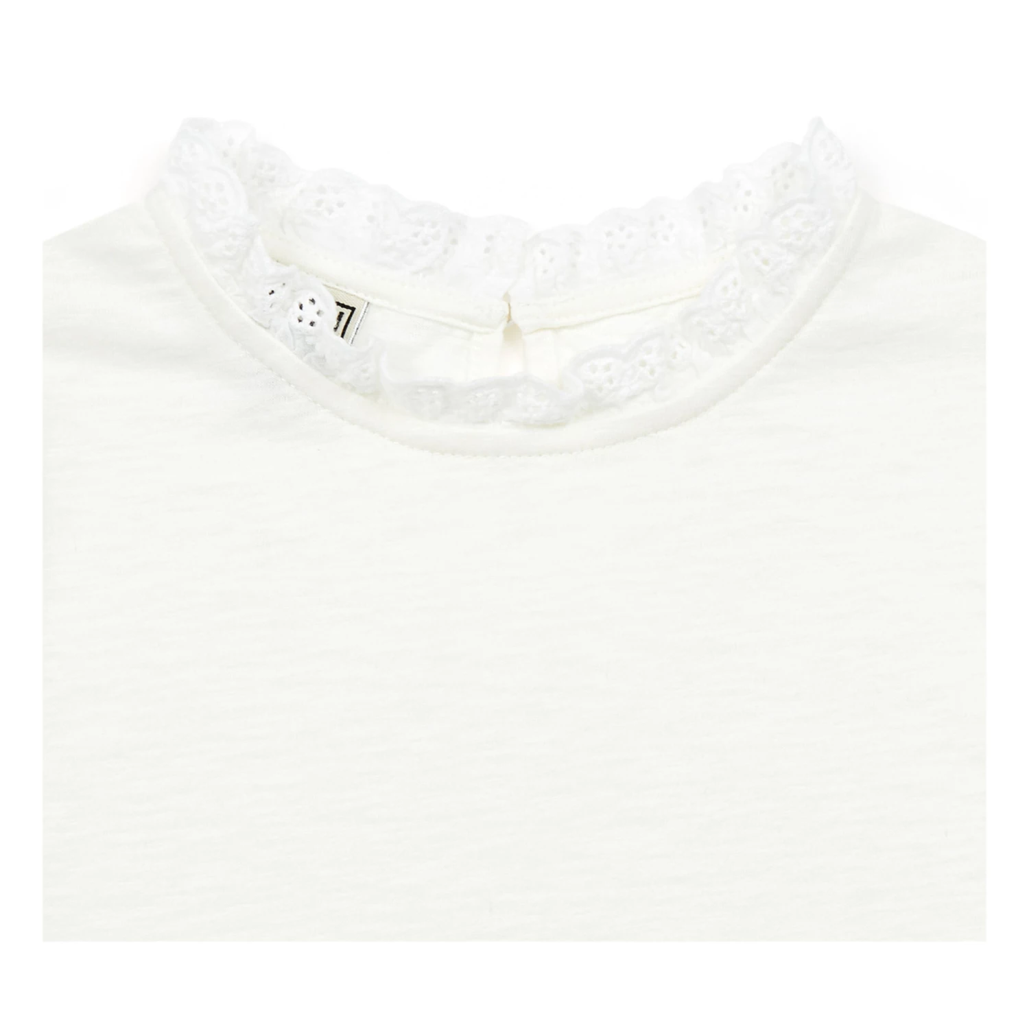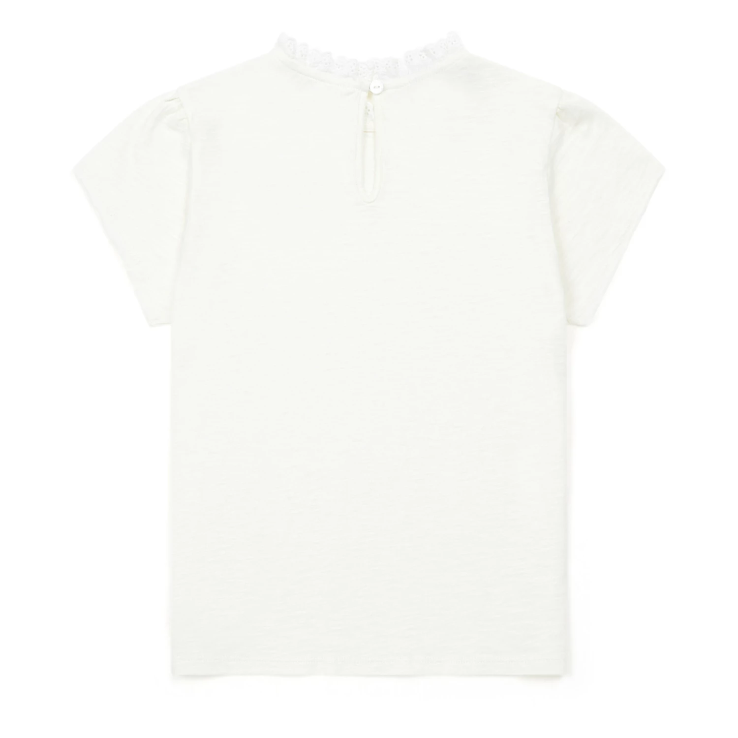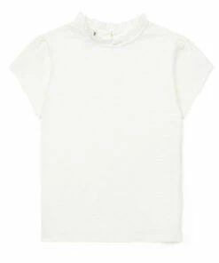 - Lace collar, Gathered armholes, Crew neck, Lightweight, Short sleeves, Top stitched edges