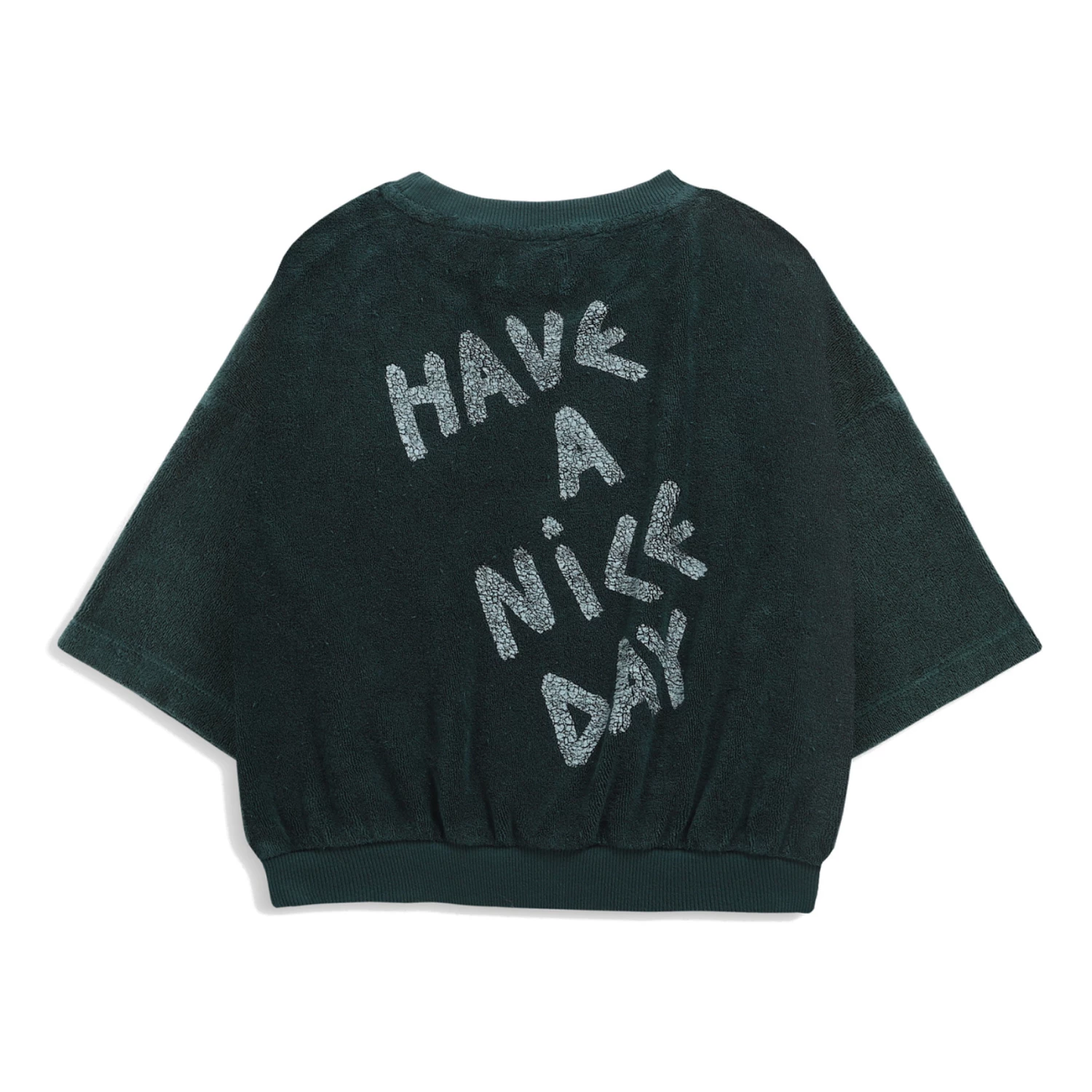 - Elastic at bottom, Crew neck, Contrasting logo, Short sleeves, Raglan sleeve, Print on front, Wide sleeves