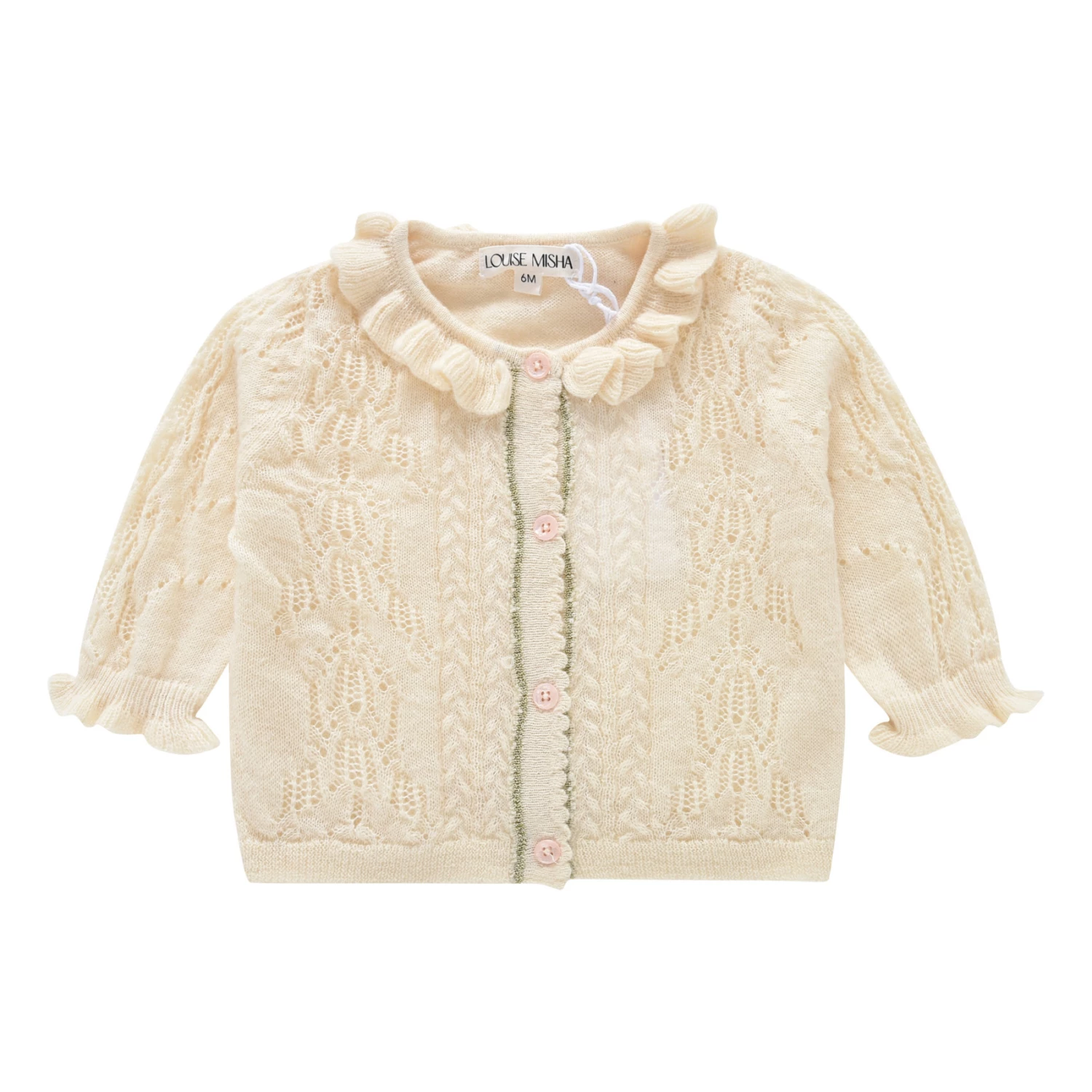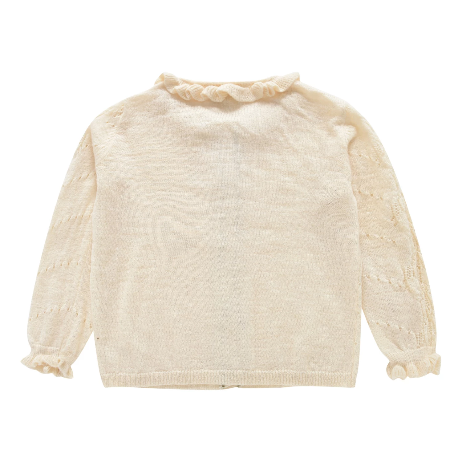 - Crew neck, Long sleeves, Smocked cuffs, Decorative knit, Openwork, Gathered collar