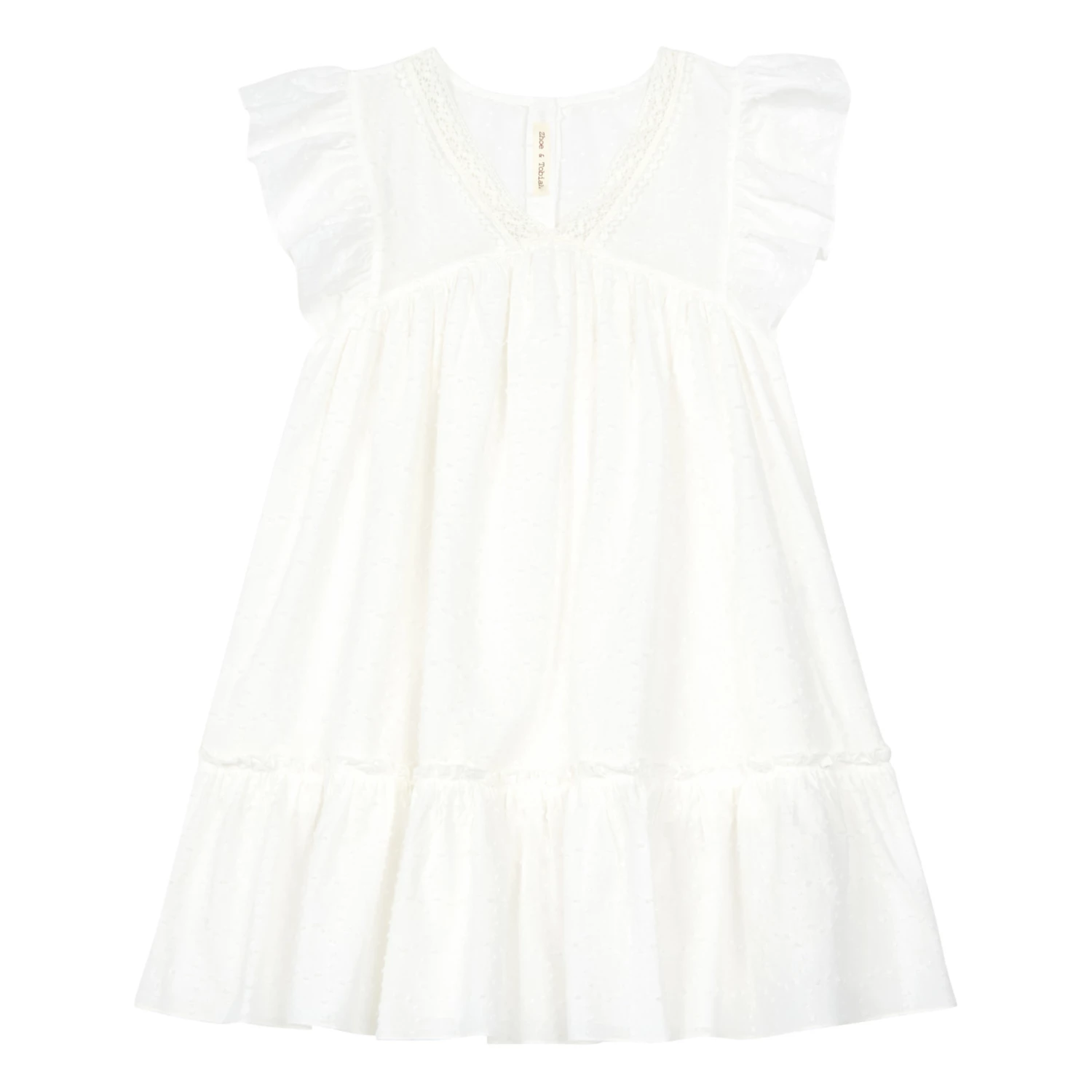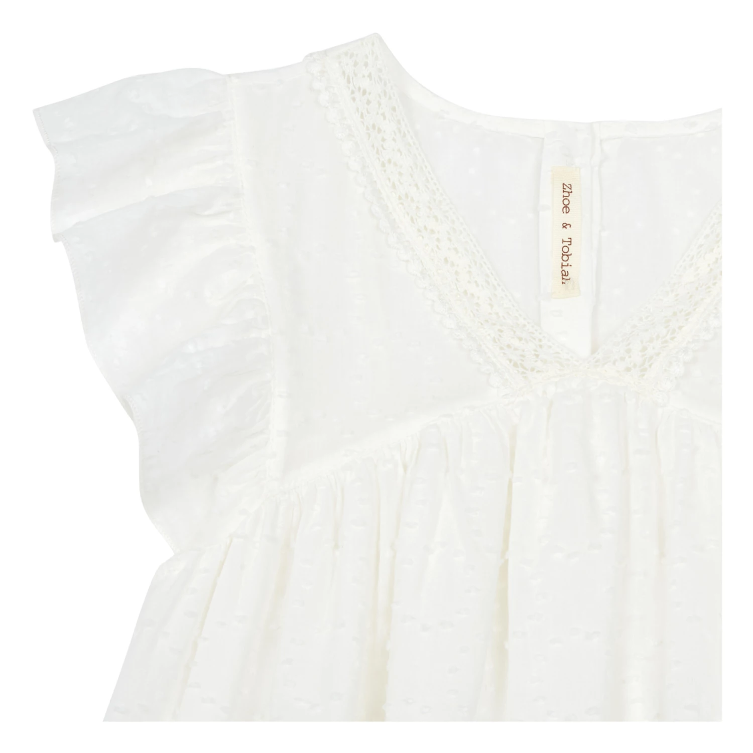 - Flounce sleeve, Lined, Gathered details, V neck, Satin stitch edge finish, Picot finish, Flowy, Lightweight, Embroidery