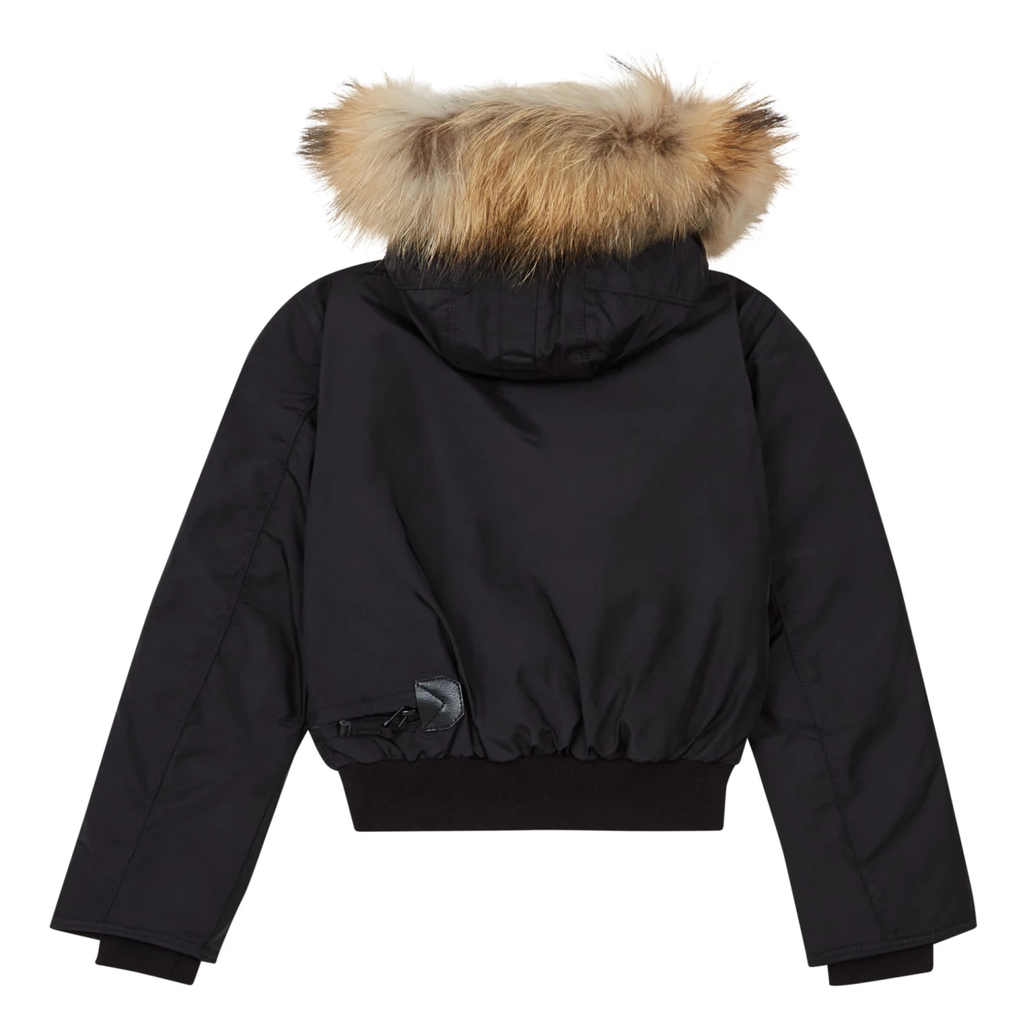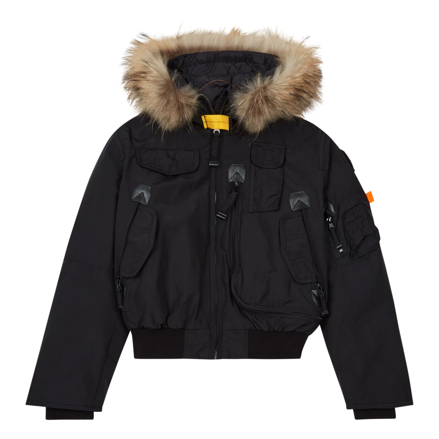 - Hooded bomber with removable genuine fur trim and removable down lining. The jacket is made of recycled nylon oxford with protective treatment and polyurethane lamination inside. Heat-sealed seams on the hood, shoulders and armholes. Multiple pockets, including a spacious front cargo pocket with mesh pocket, as well as two inside pockets and a pocket on the left sleeve. Reinforced elbow patches. Ribbed cuffs and bottom hem. Front zipper closure. Collar with iconic yellow elastic strap closure and PJS crest on left sleeve.