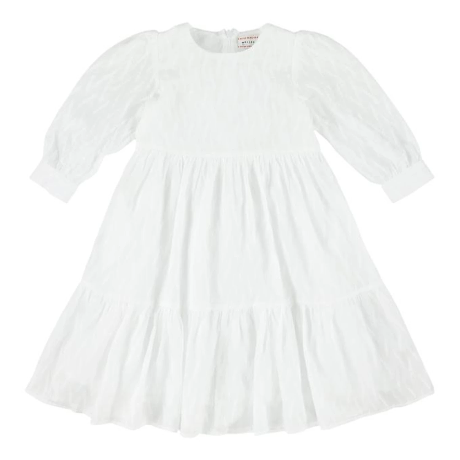 - Tightened at the wrists, Tone-on-tone embroidery, Crew neck, Flowy, Long sleeves, Pleated