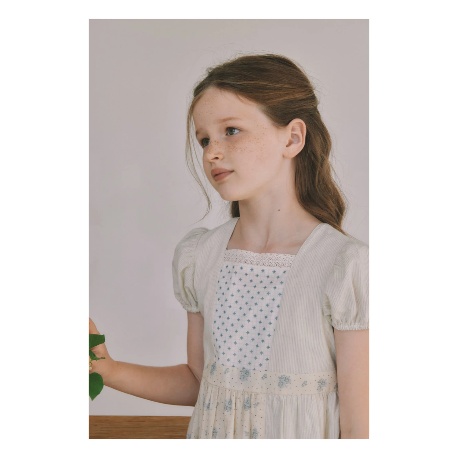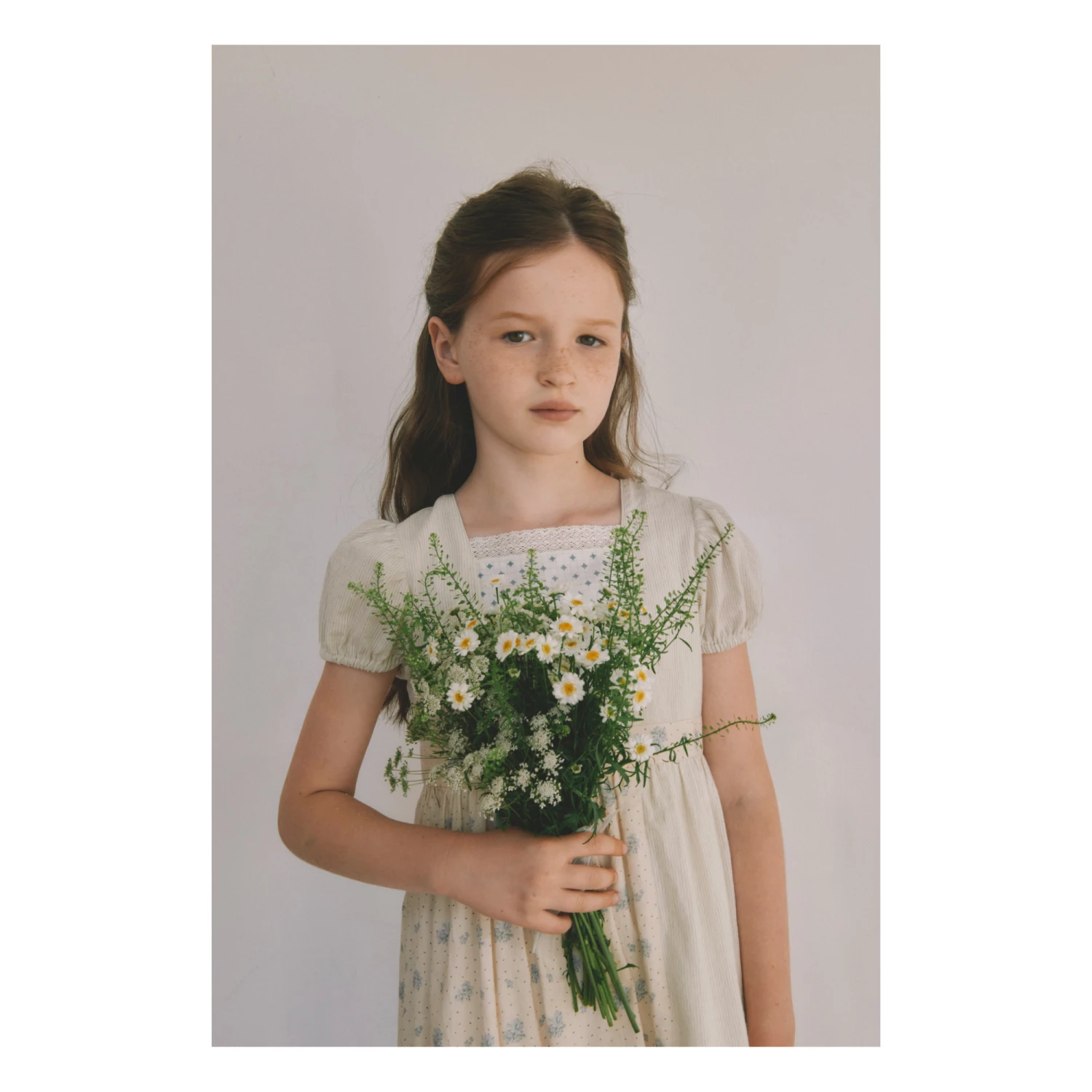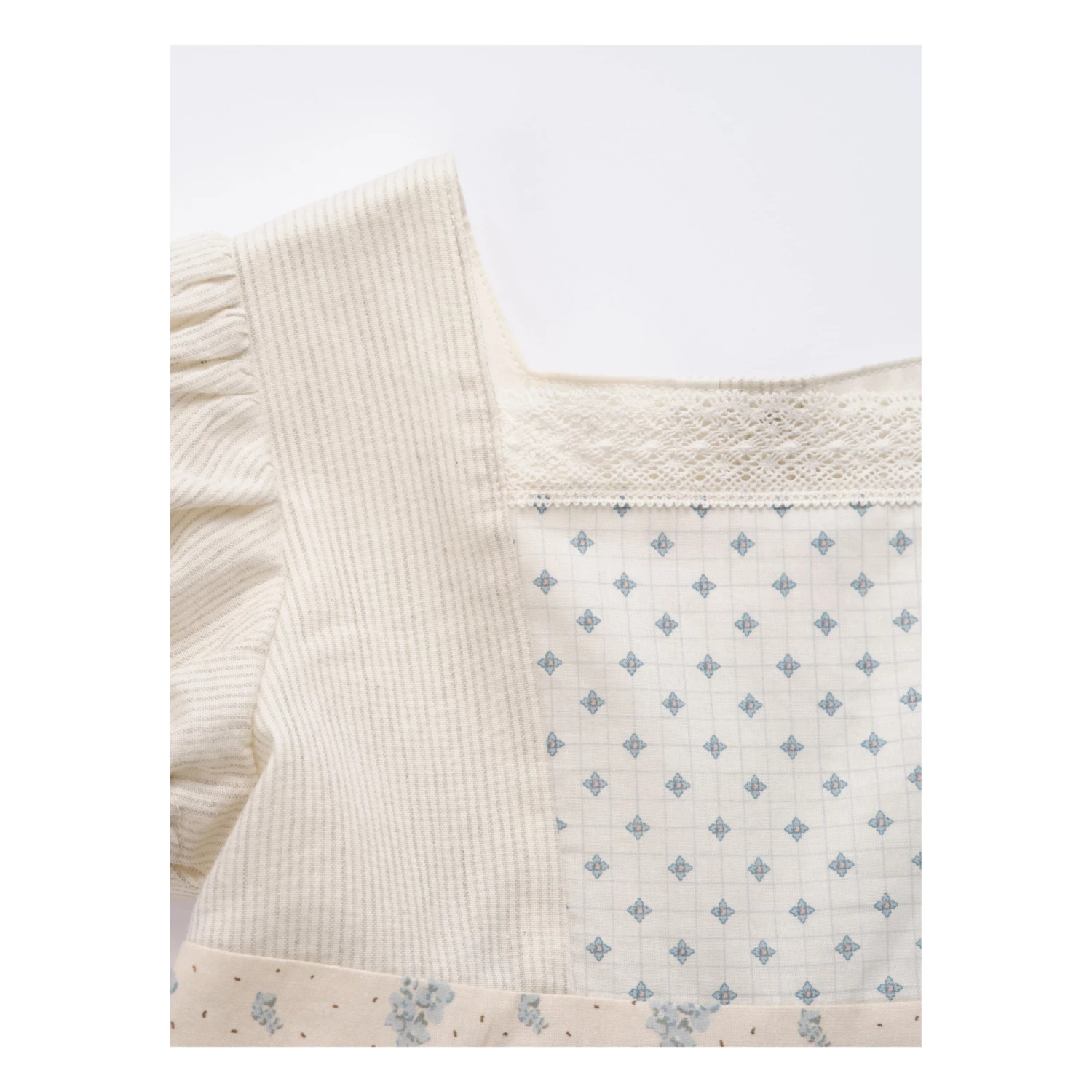 - Decorative bow(s), Contrast stitching, Lace details, Square neck, Balloon sleeves, Short sleeves, Pleated
