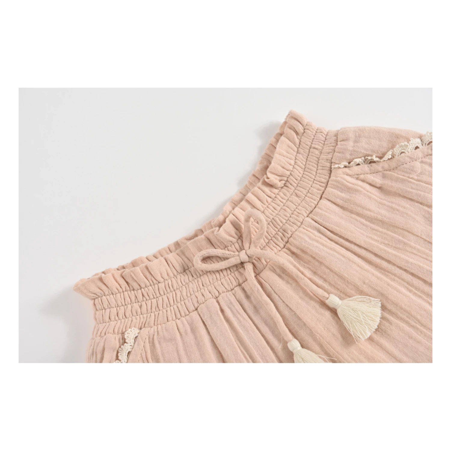 - Contrast stitching, Top stitched, Flowy, Drawstring(s), Scalloped edges, Front patch pocket(s), Pompom(s), Elasticated waist, Adjustable waist, Gathered at the waist, Embroidery