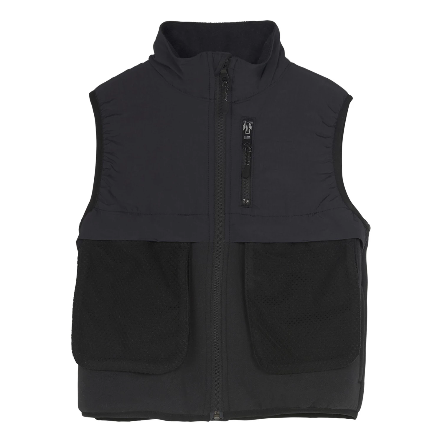 - Elasticated trim, Gathered armholes, Dual-material, Mesh pocket(s), Breast pocket(s), Zipped pocket(s), Sleeveless, Turtleneck