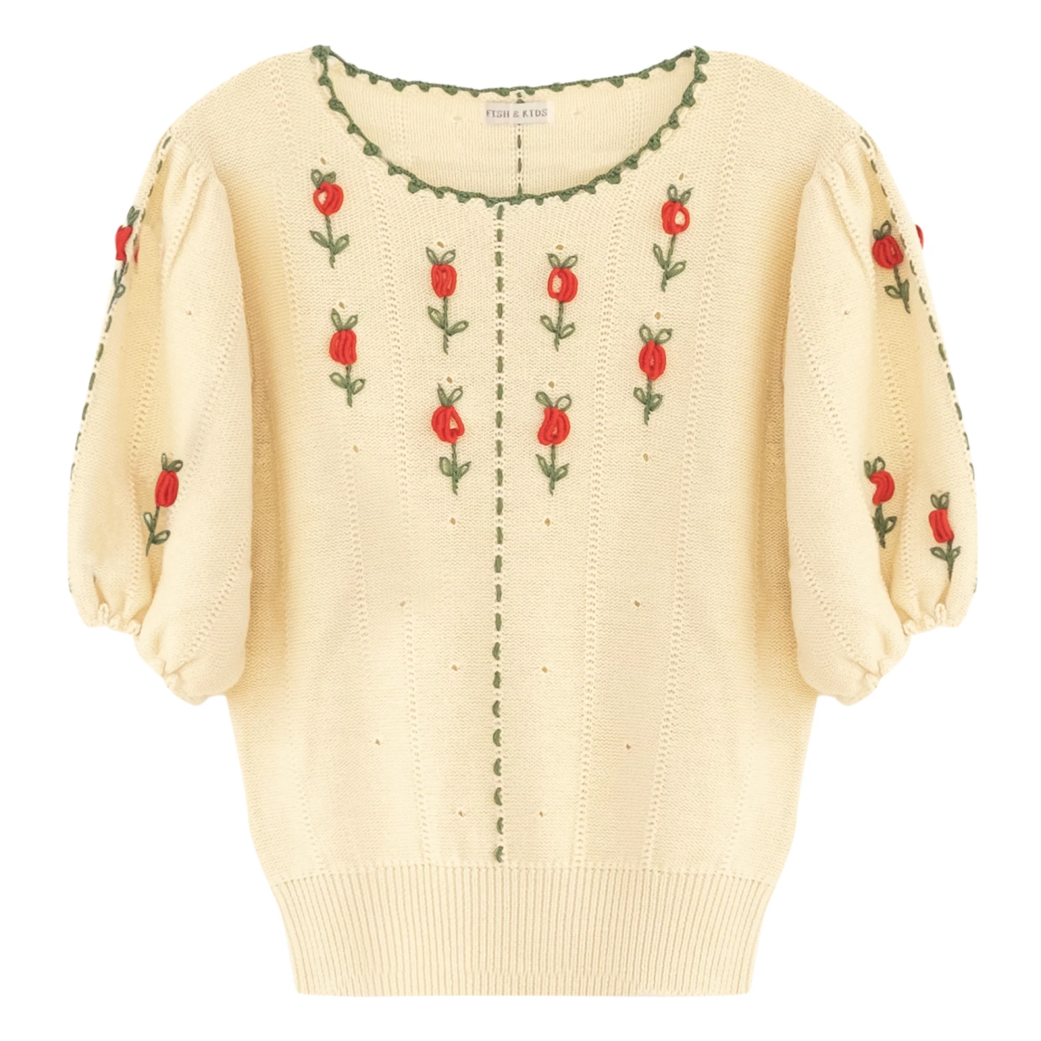 - Crew neck, Picot finish, Balloon sleeves, Raglan sleeve, Gathered cuffs, Ribbed edges, Decorative knit, Embroidery