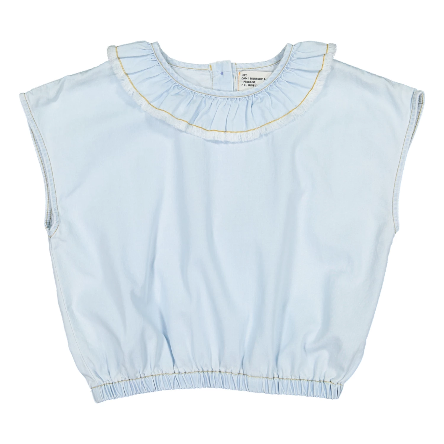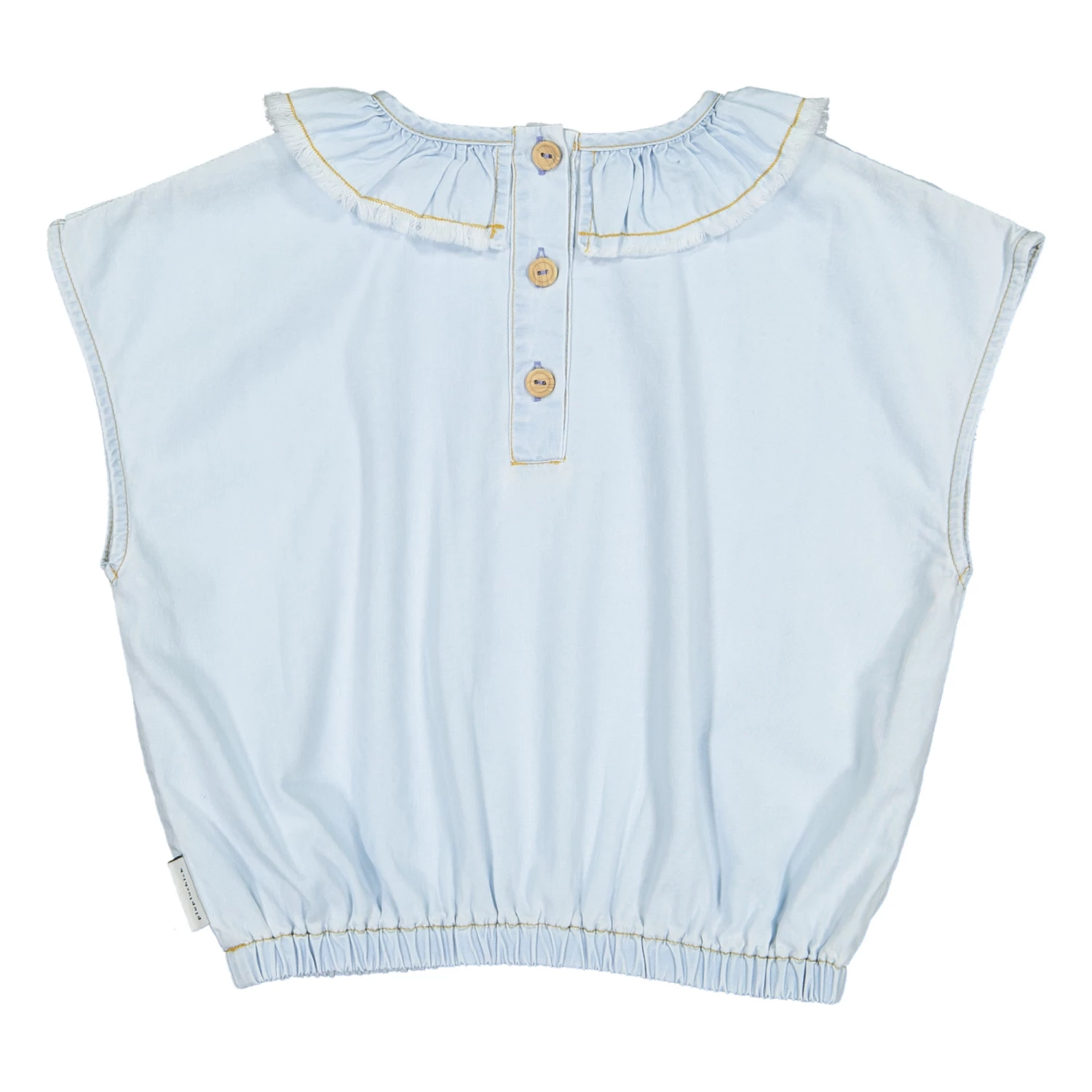 - Elastic at bottom, Crew neck, Top stitched, Sleeveless, Contrasting top stitch, Ruff collar