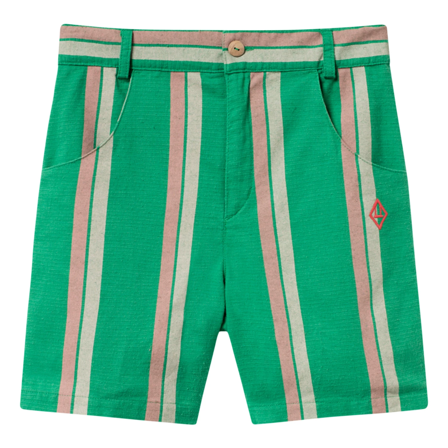- Button(s) at the waist, Zip closure, Stripe print
