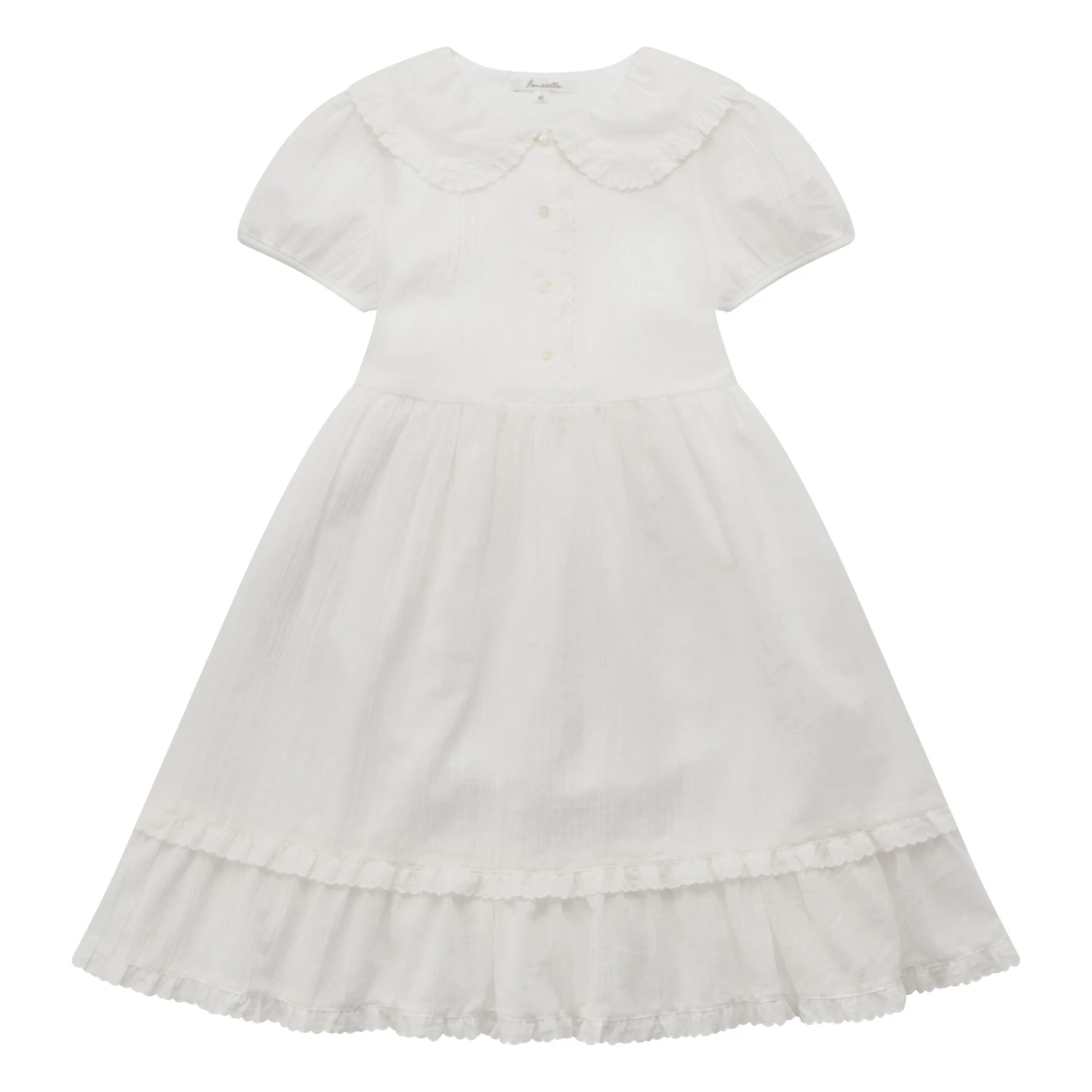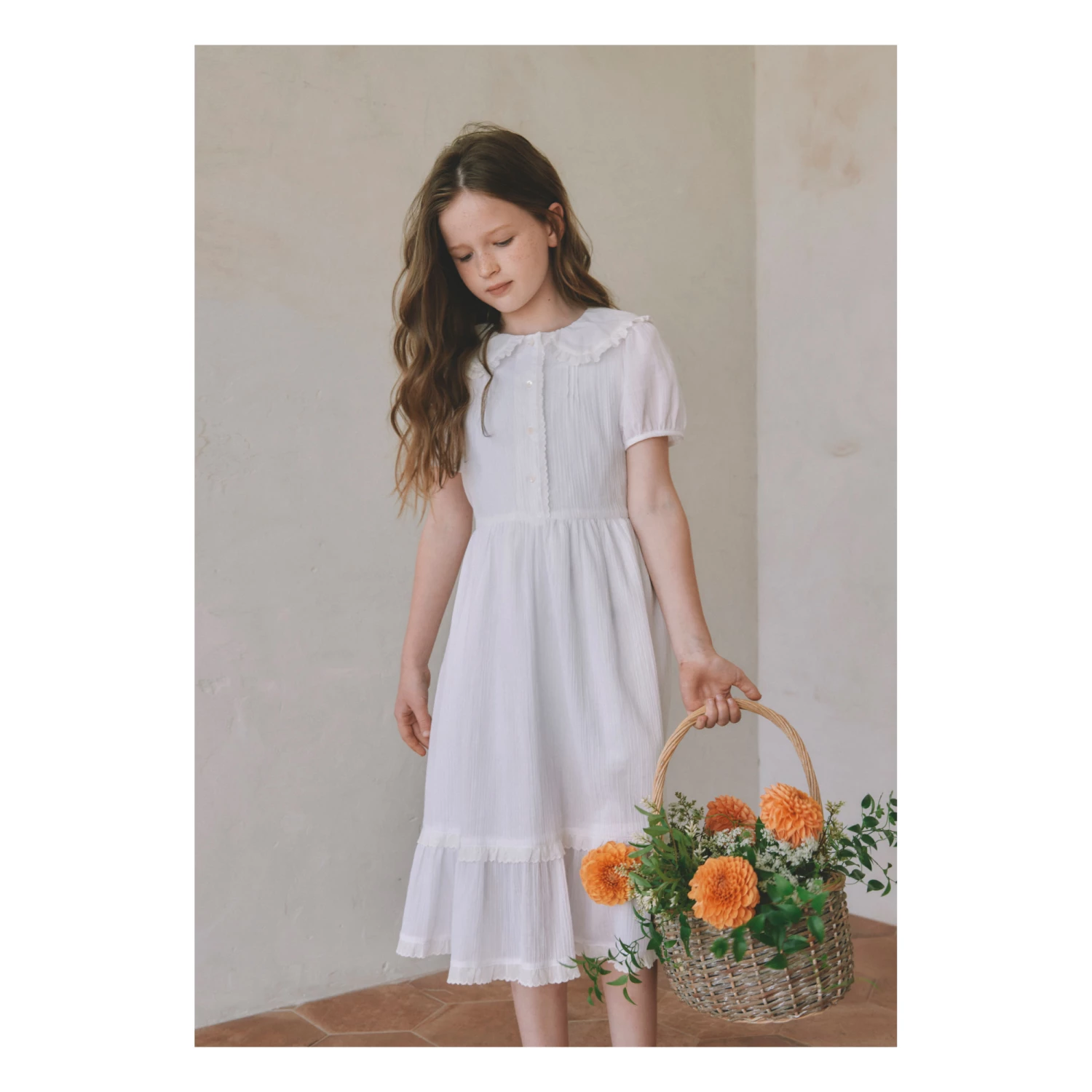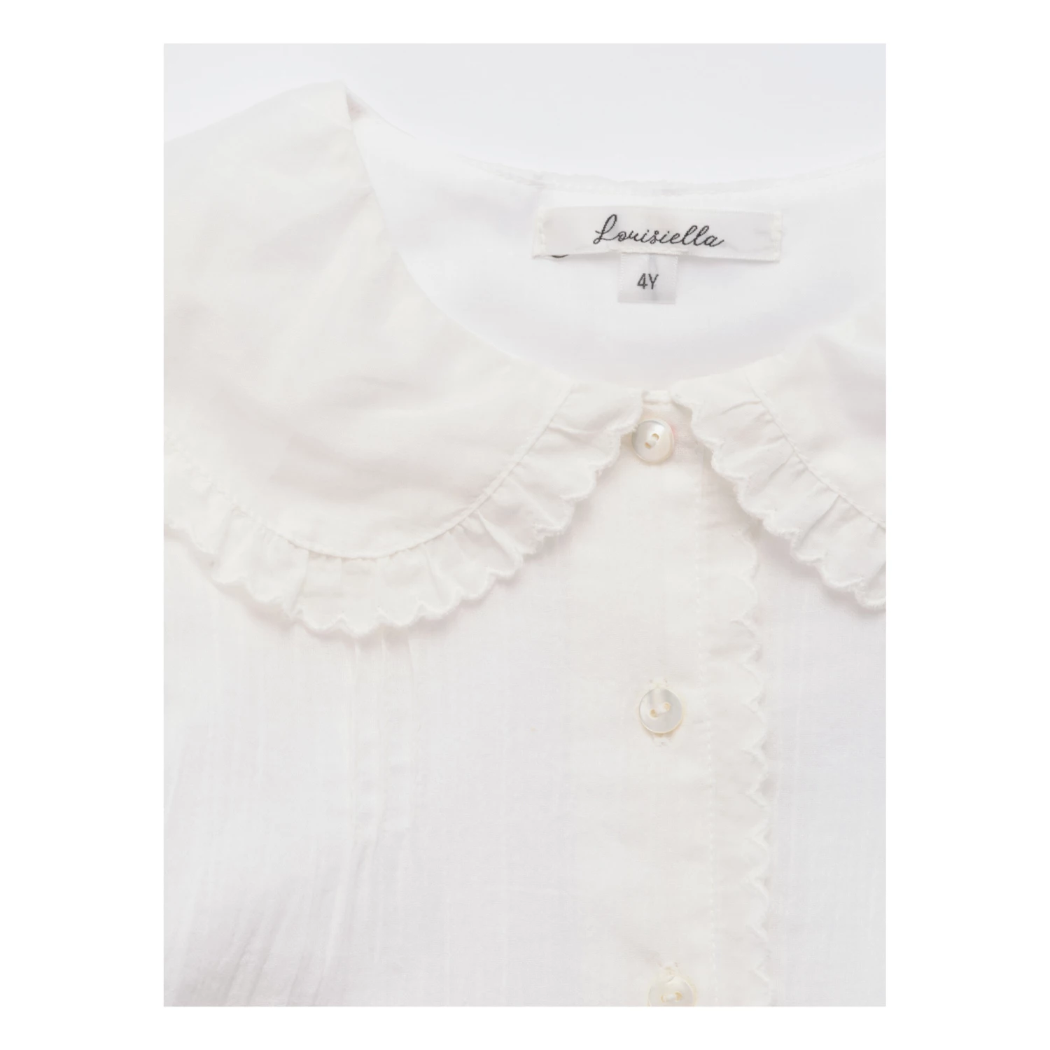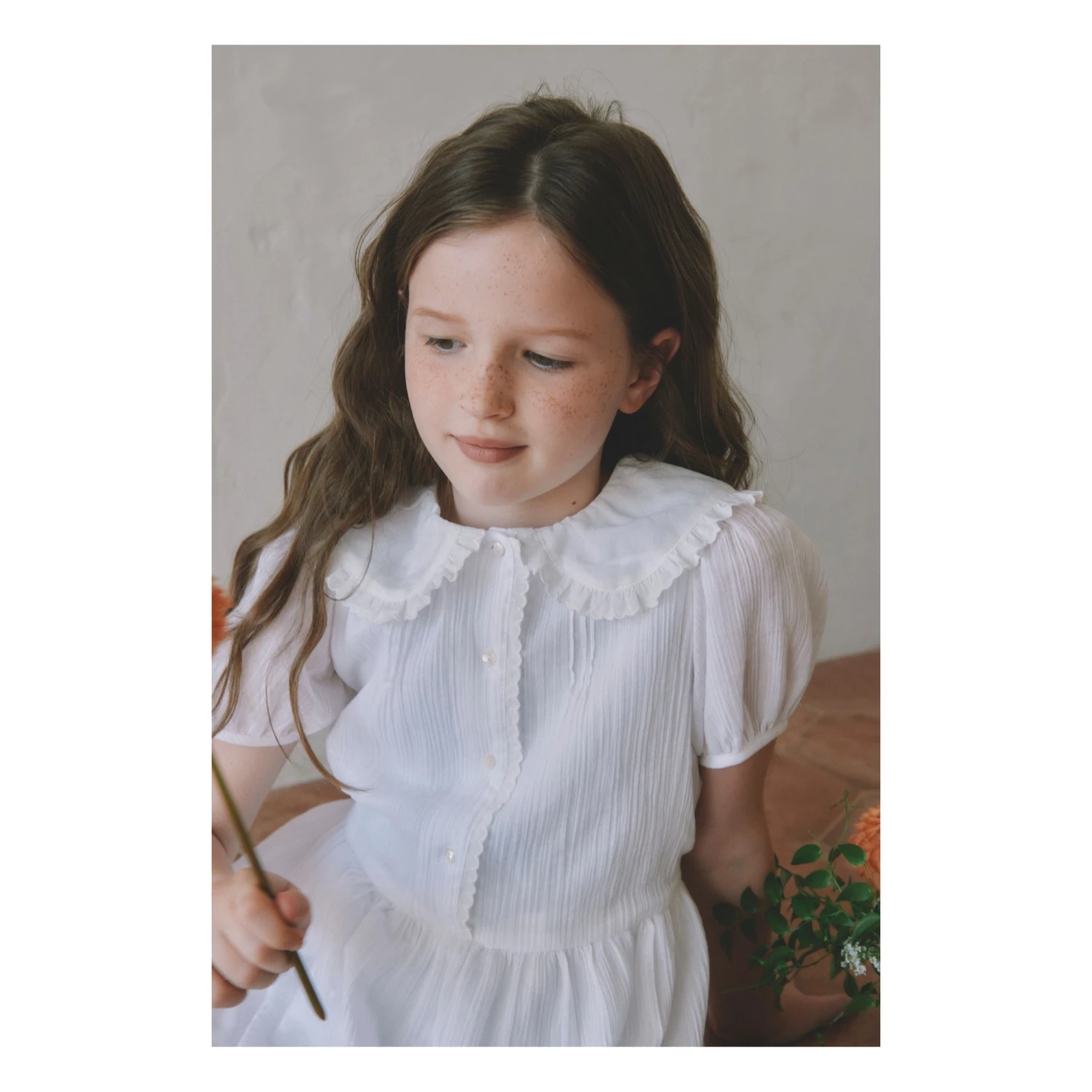 - Frilled yoke, Flowy, Lightweight, Short sleeves, Knife pleat(s), Scalloped edges, Peter Pan collar, Frilled collar