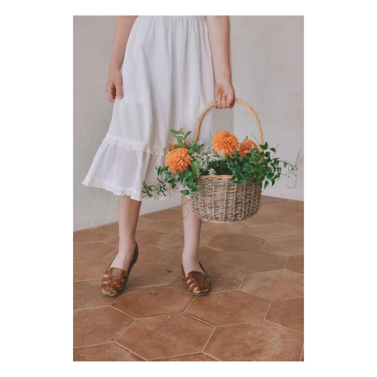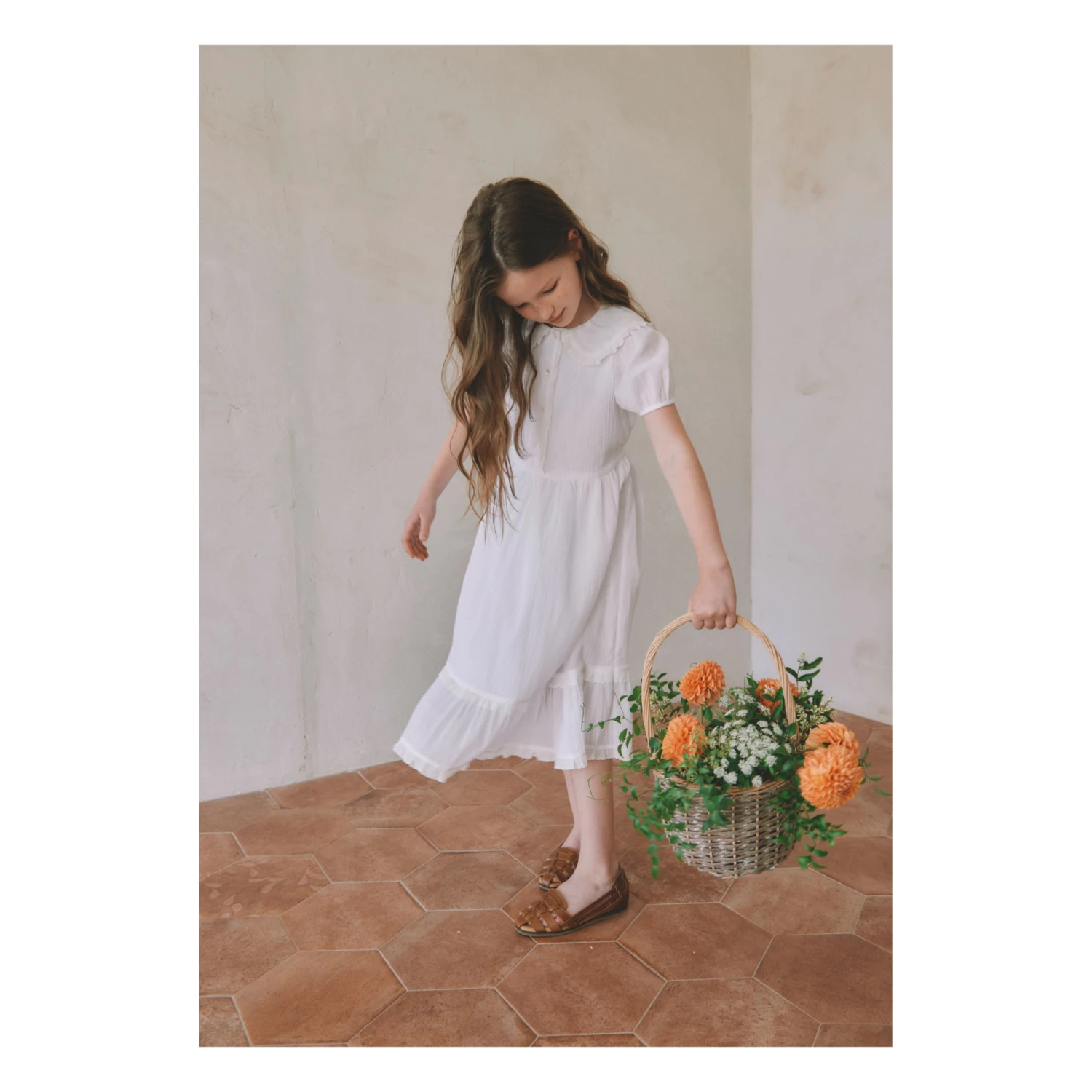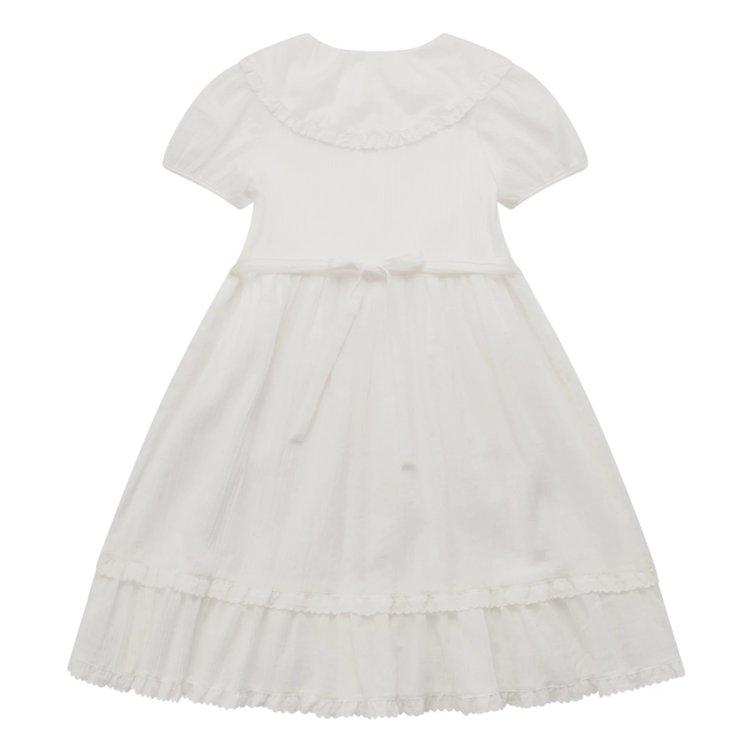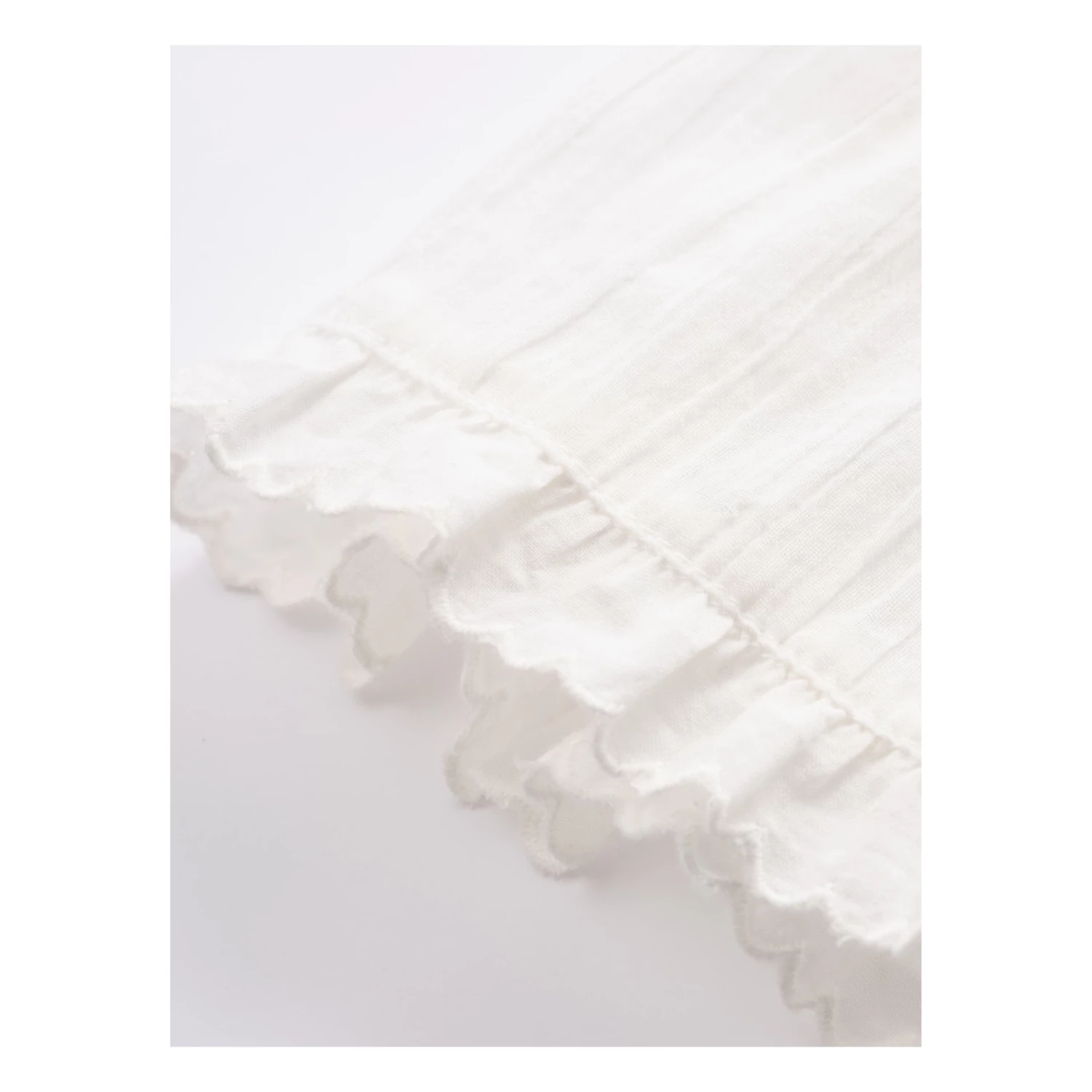 - Frilled yoke, Flowy, Lightweight, Short sleeves, Knife pleat(s), Scalloped edges, Peter Pan collar, Frilled collar