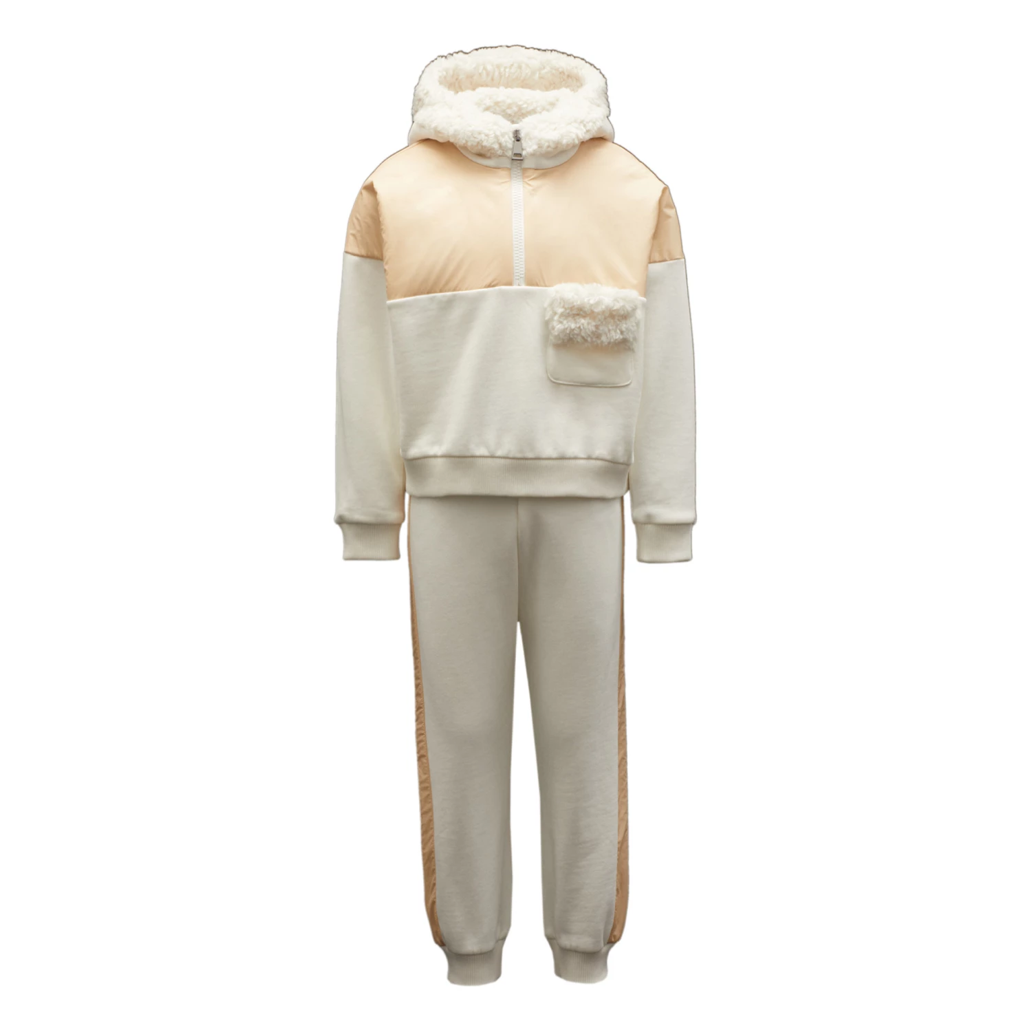 - This girls’ top and bottom set is a unique combination of pleasant materials and graphic details. It is made of fleece with nylon inlays – a characteristic of Moncler’s utilitarian designs – as well as teddy bear effect fleece details that give it that precious touch.