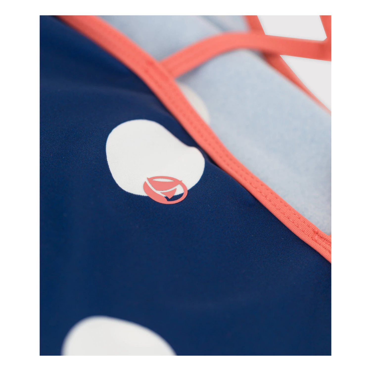 - Crew neck, Contrasting logo, Contrasting edges, Crossed back straps, Frilled straps