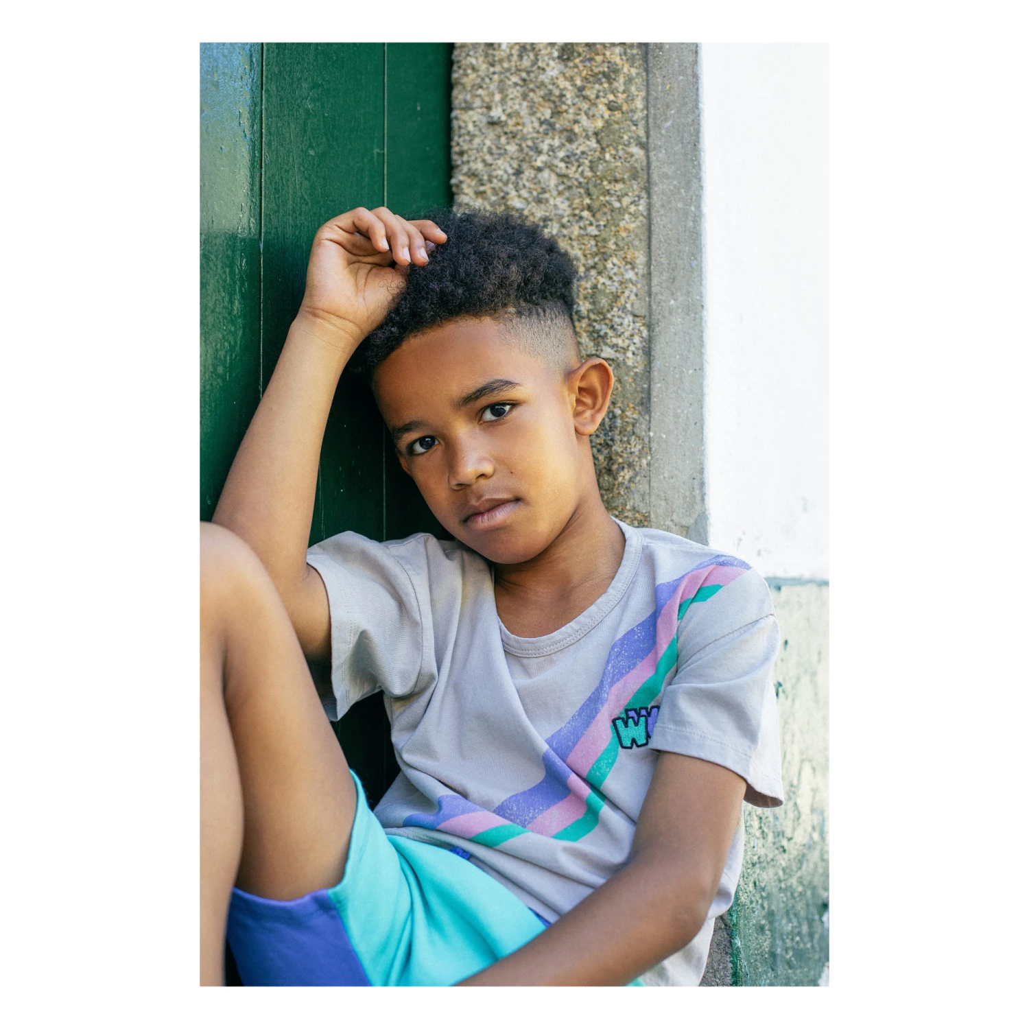 - Low armholes, Crew neck, Top stitched, Short sleeves, Print on front, Tricolour
