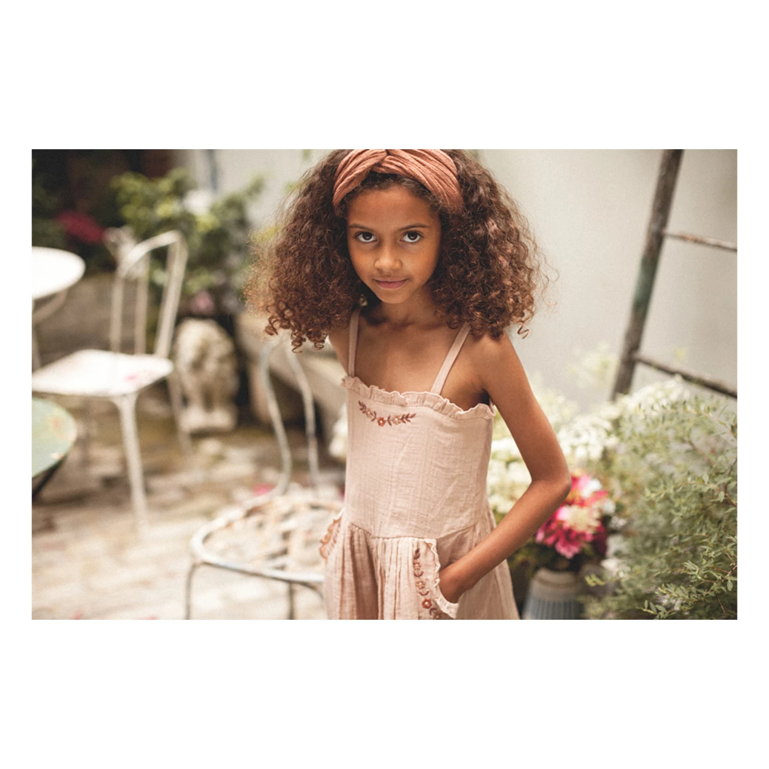 - Square neck, Top stitched, Knife pleat(s), Front patch pocket(s), Frilled edges, Thin straps, Embroidery
