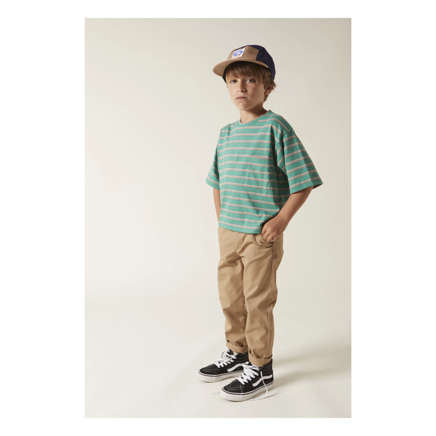 - Garment pulls on, Stripe print