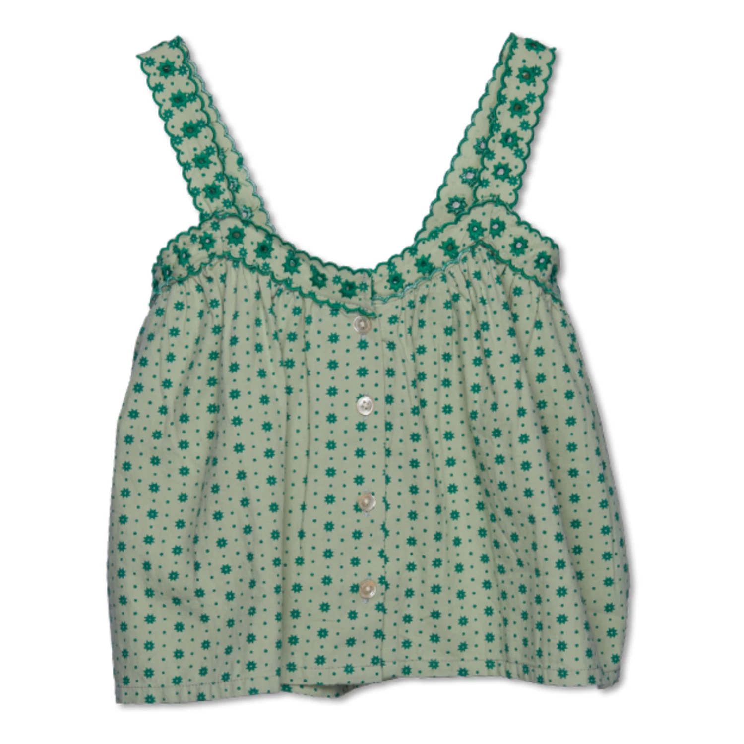 - Cowl neck, Scalloped edges, Top stitched edges, Openwork, Thick straps, Embroidery, Comfortable
