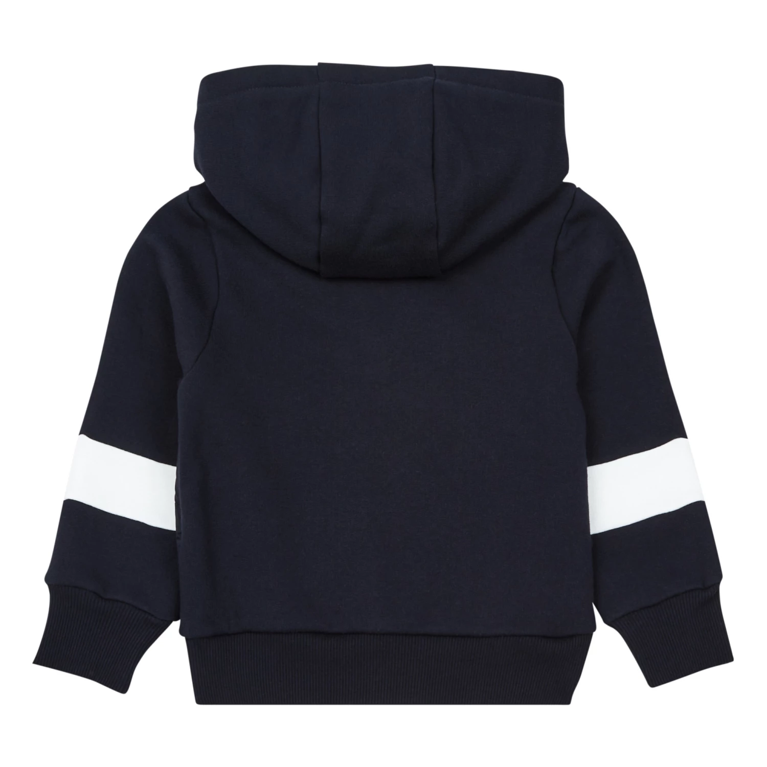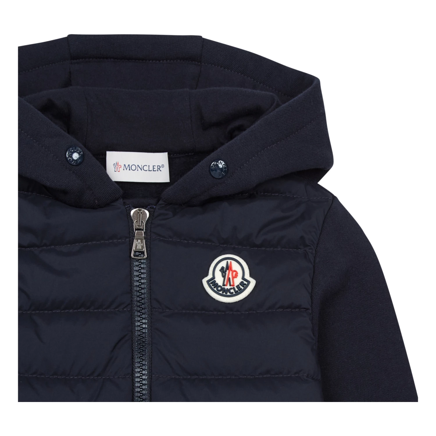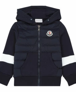 - Keep your child warm without weighing them down with this navy blue hooded down jacket from Moncler Kids. It is made of comfortable cotton, with down and feather padding on the front. Its zip closure makes it easy to wear.