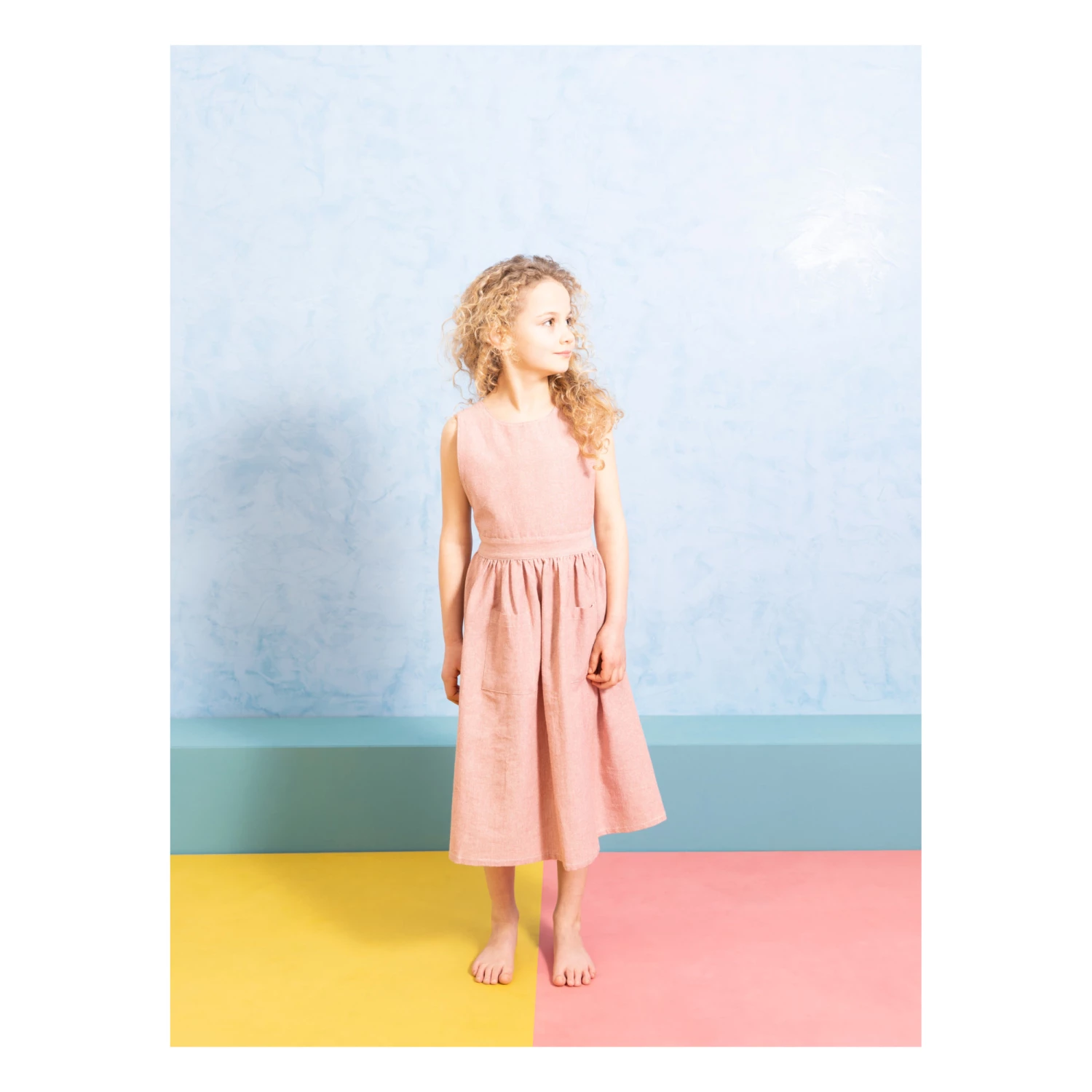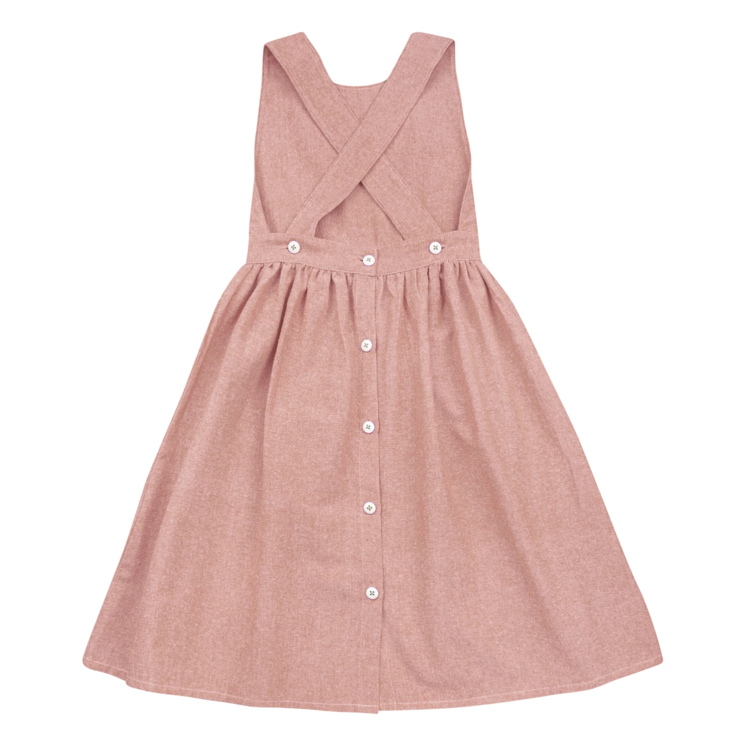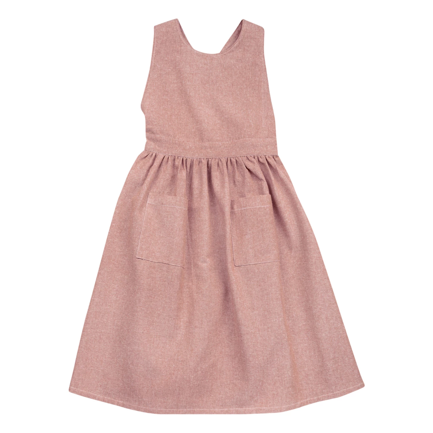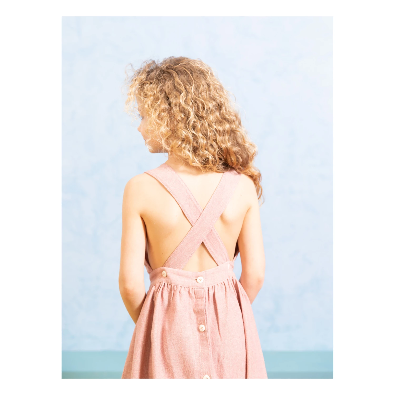 - Backless, Crew neck, Top stitched, Flowy, Front patch pocket(s), Gathered at the waist, Straps with buttons, Crossed back straps, Comfortable