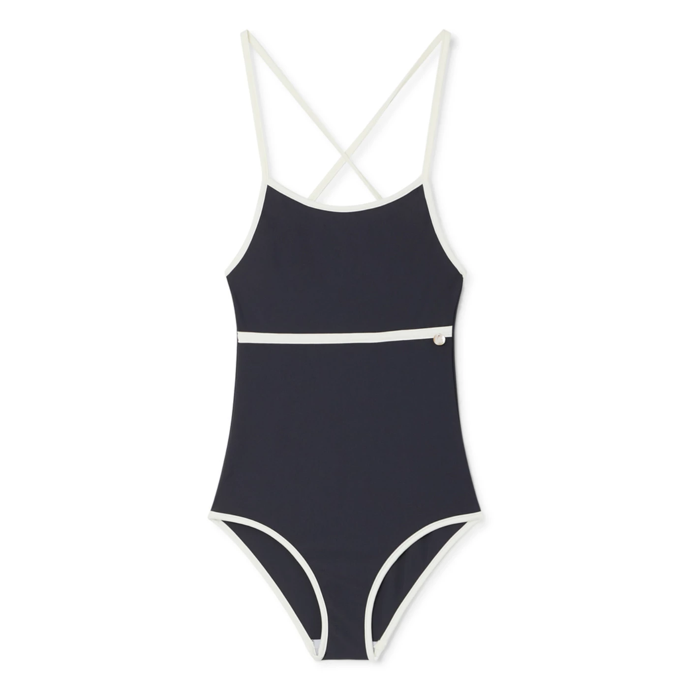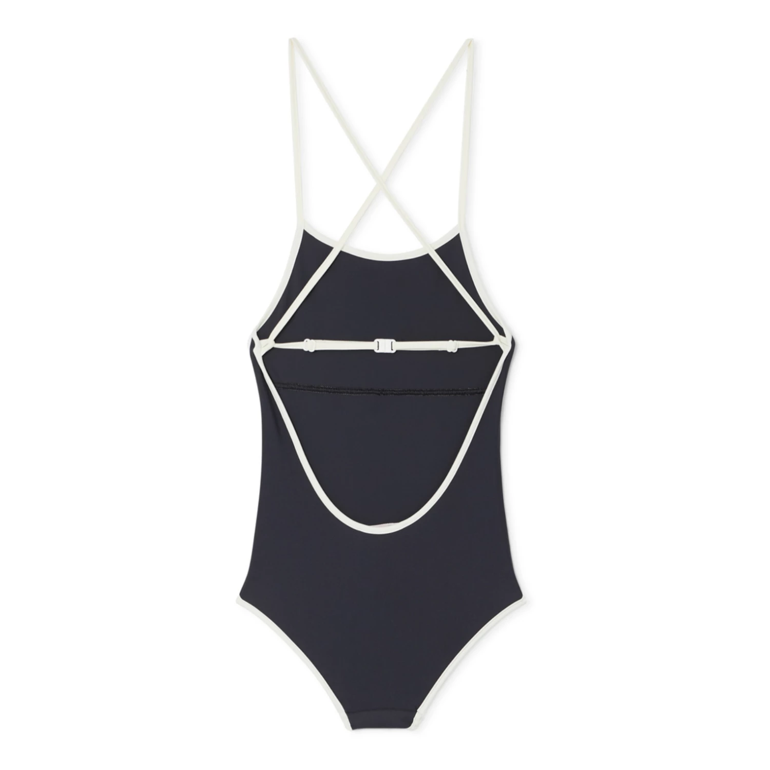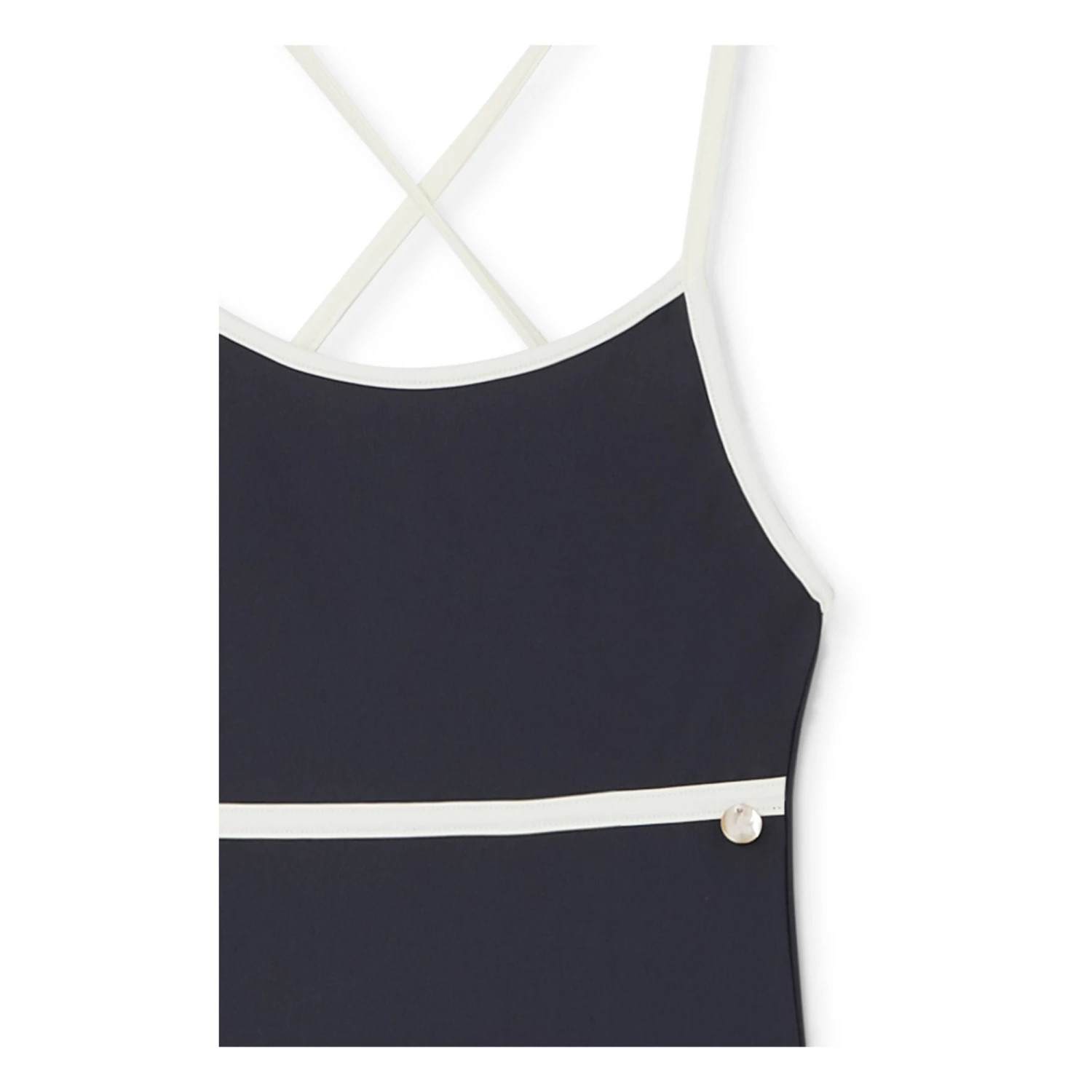 - Top stitched edges, Crossed back straps, Thin straps
