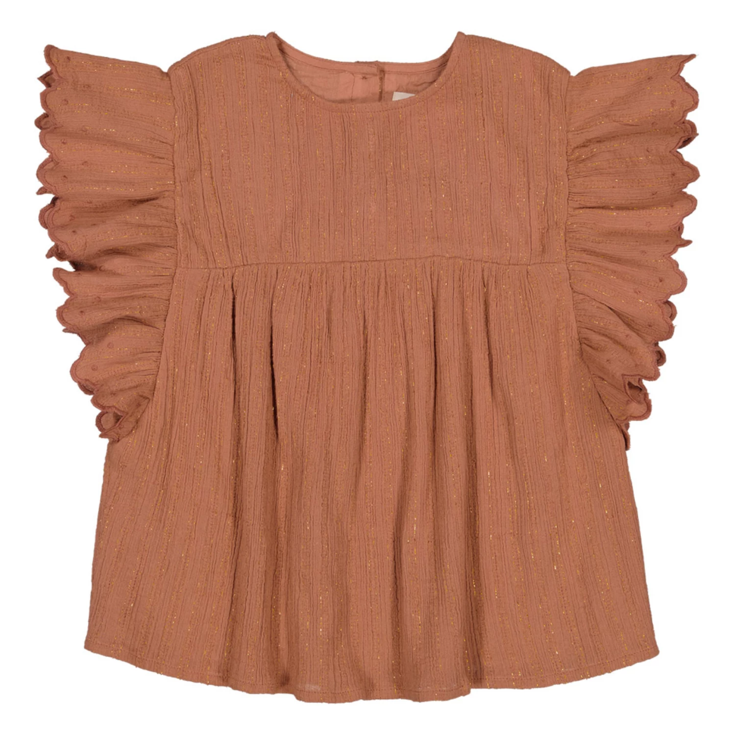 - Frilled sleeves, Crew neck, Sleeveless, Contrasting top stitch, Pleated, Contrasting edges, Embroidery