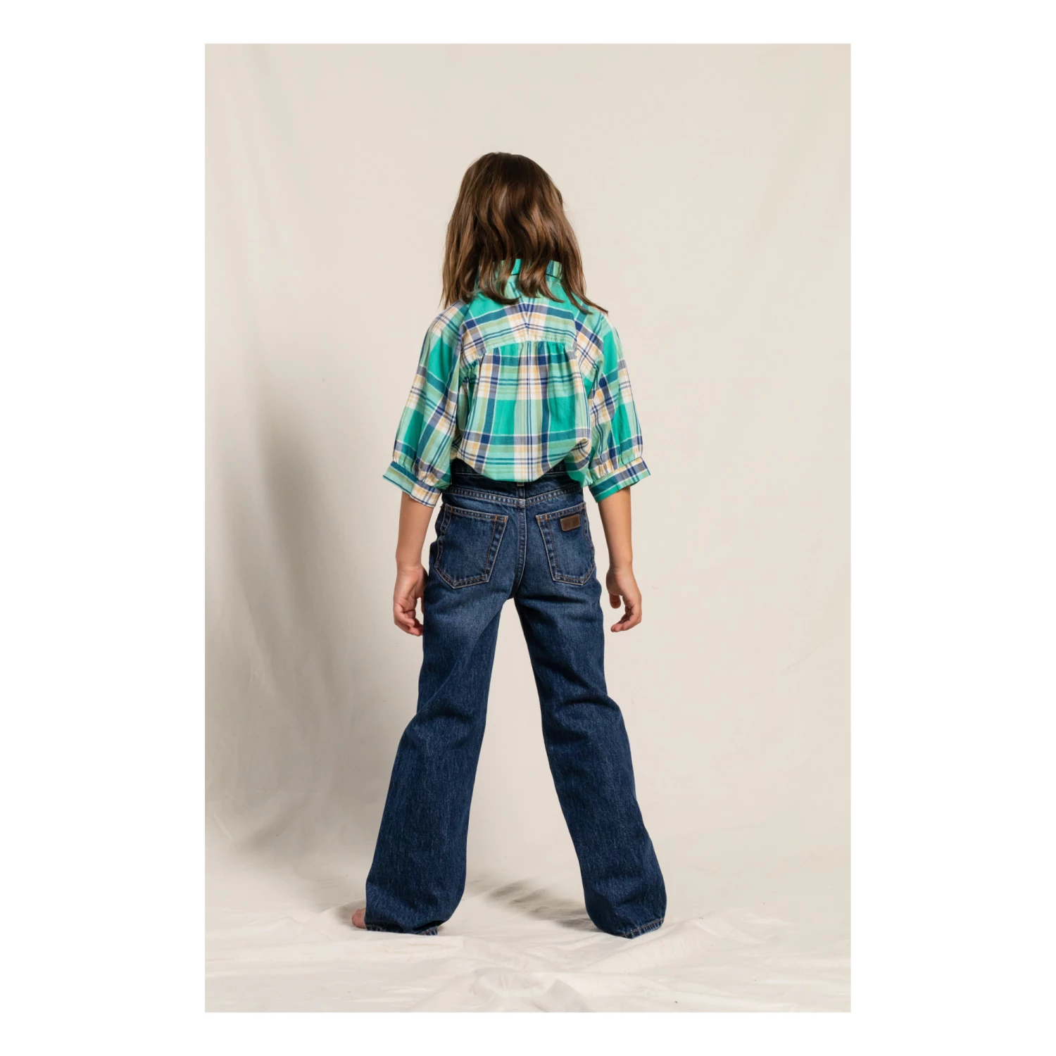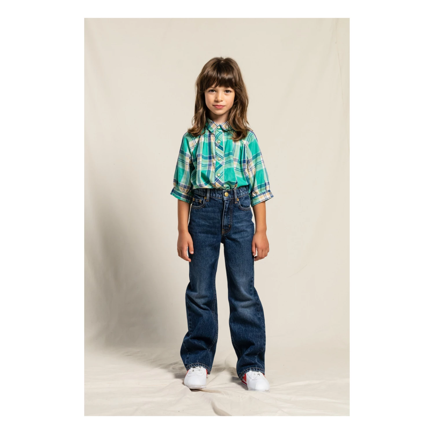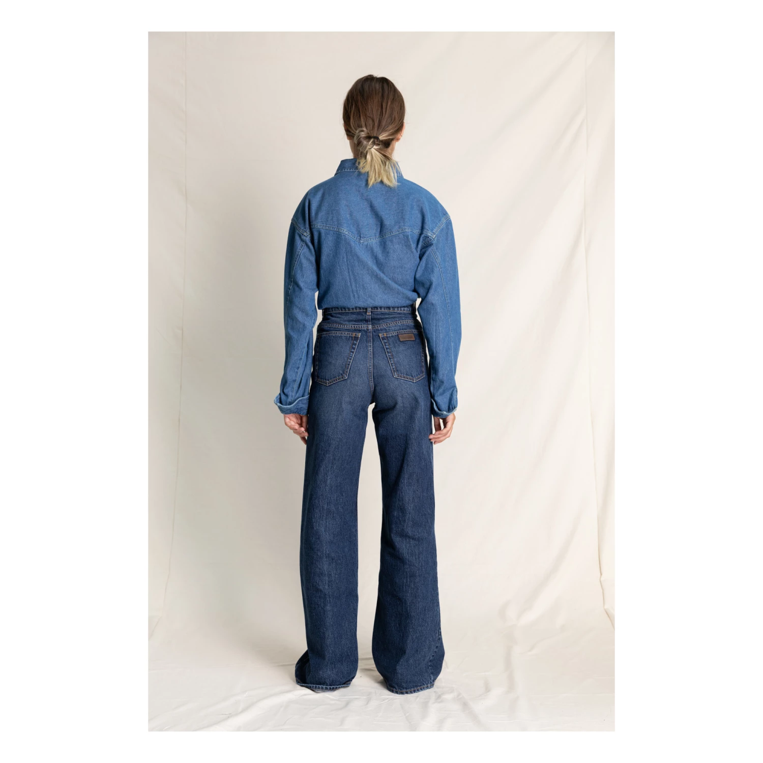 - Details : Flare Cut, Empire waistline, Belt loops, 5 pockets, Zip, Waist button, Contrast topstitchings, Rivets