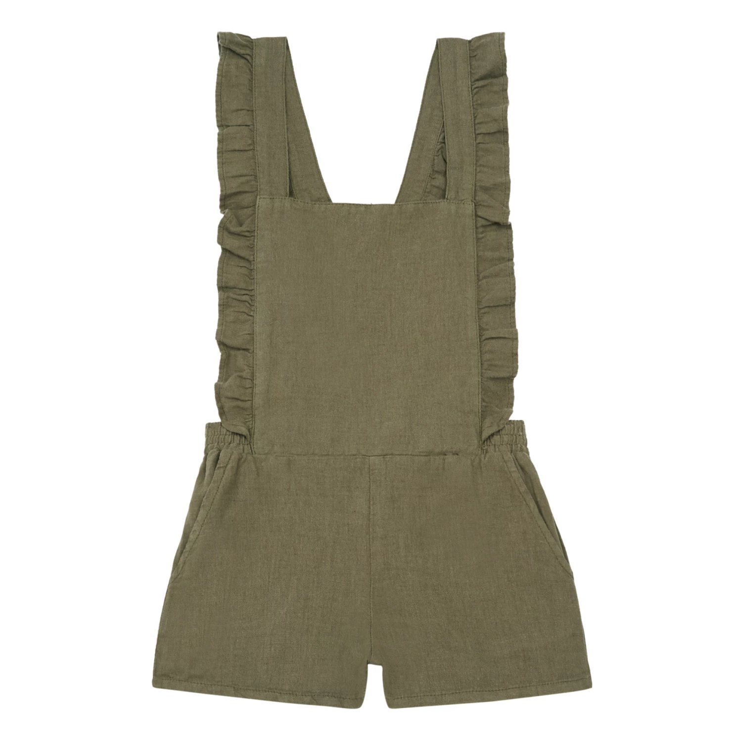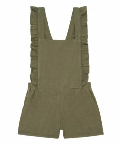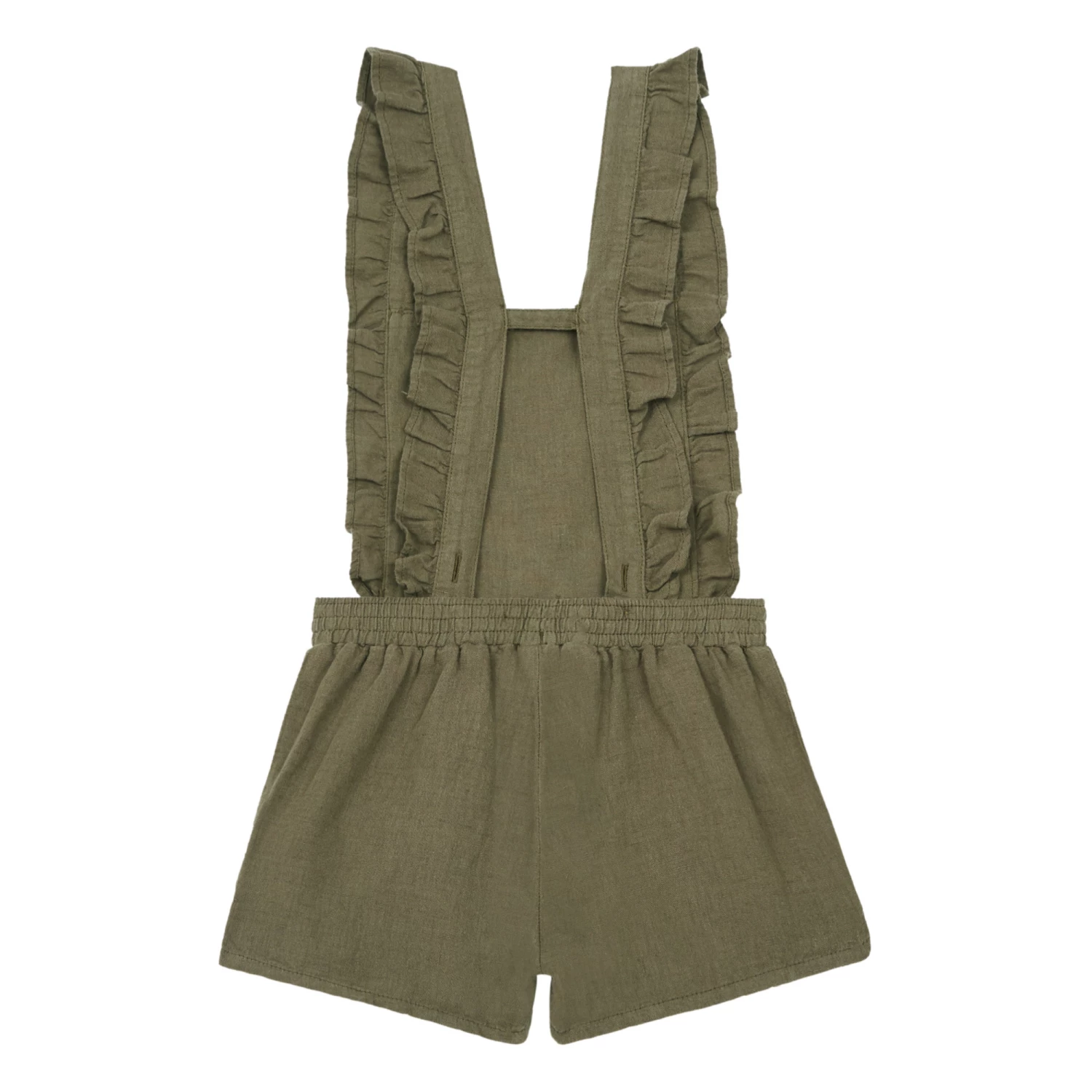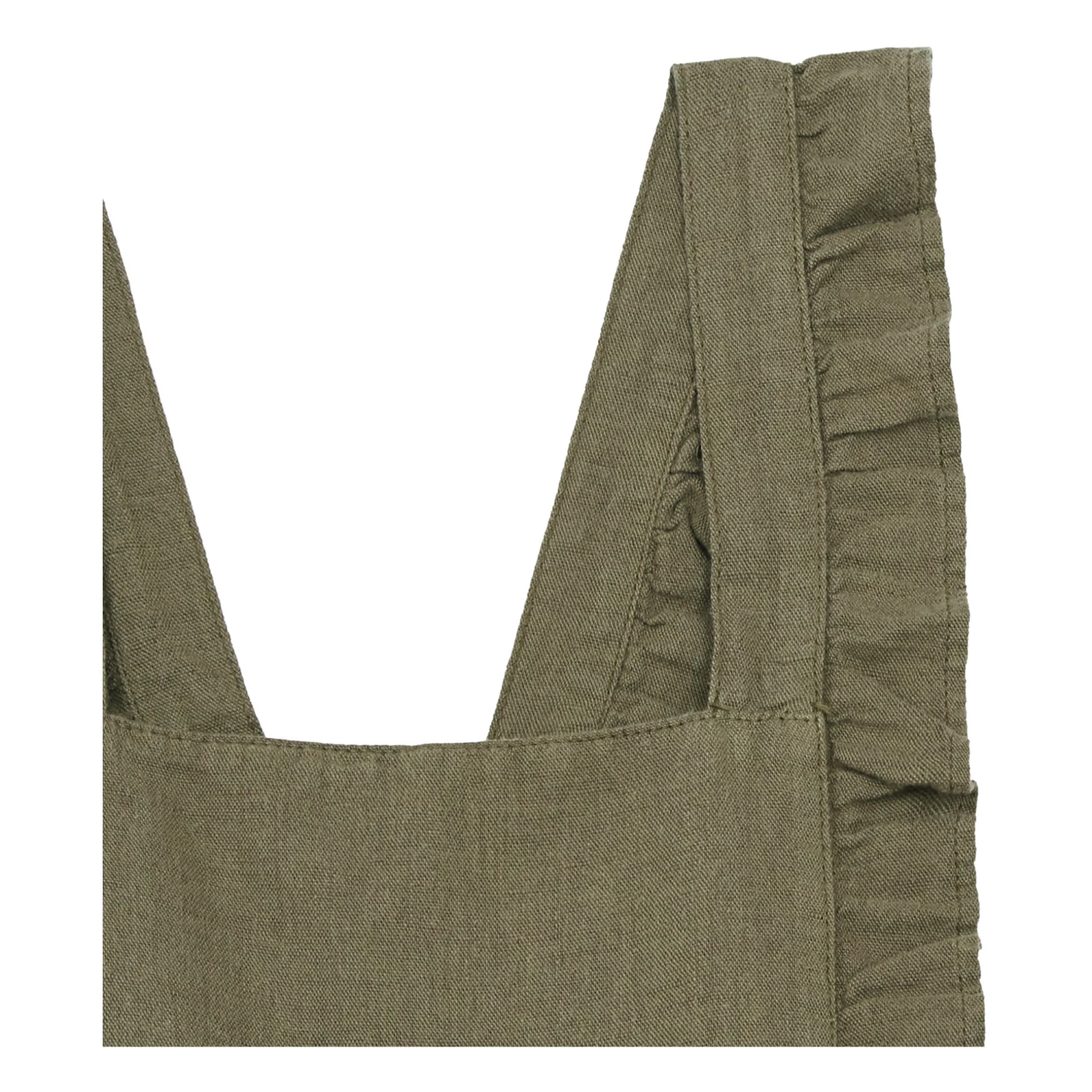 - Contrast stitching, Elasticated waist at the back, Square neck, Top stitched, Side pockets, Crossed back straps, Frilled straps