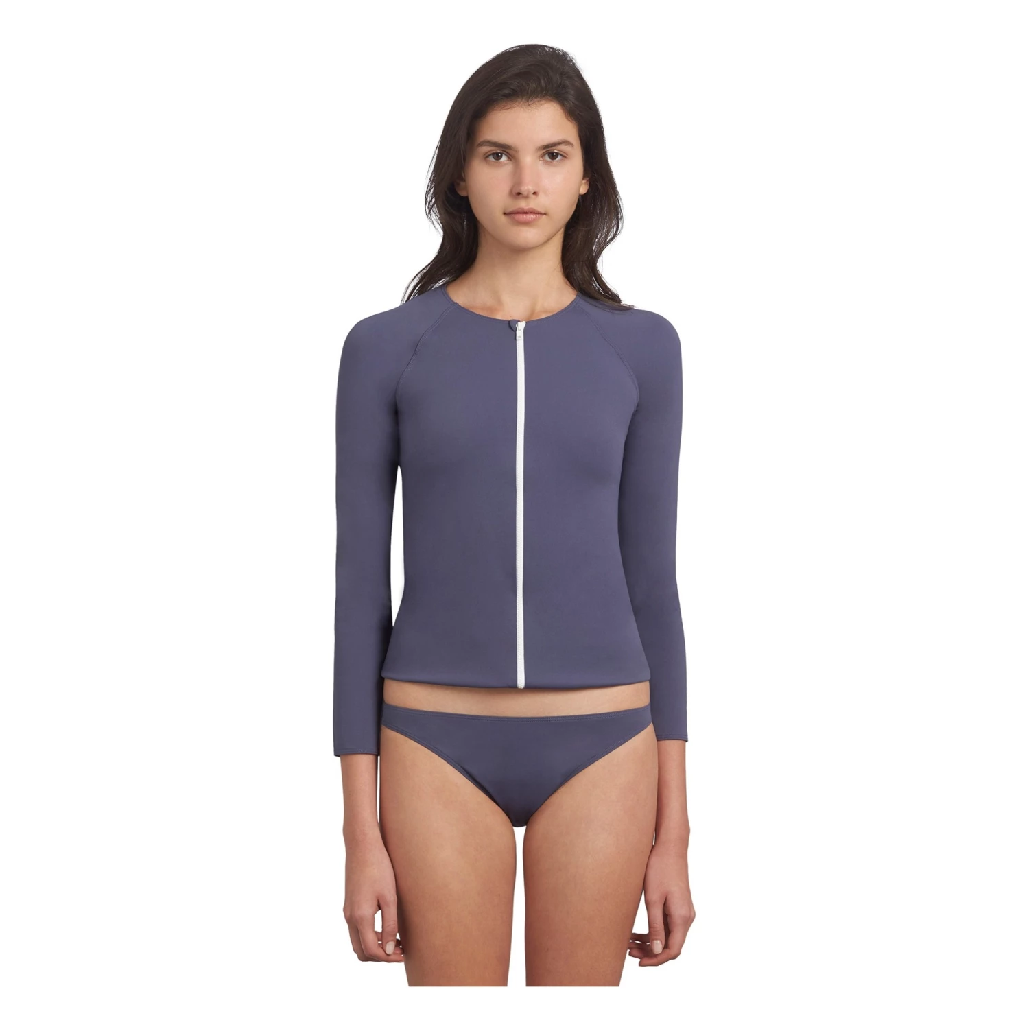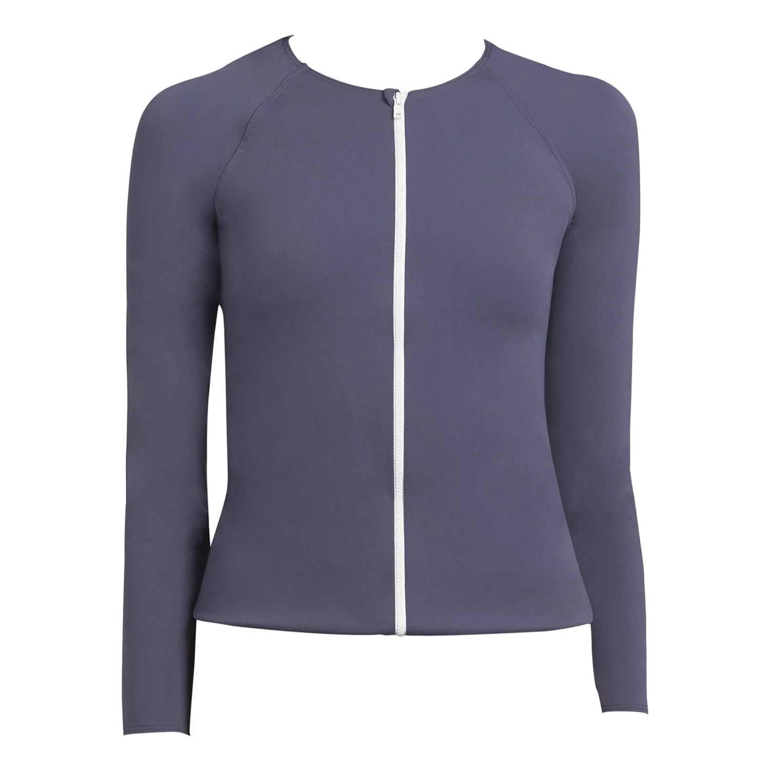 Long-sleeved jacket. Full length white zip at front with protective panel. Designed to wear over swim set or just as a stand alone top.