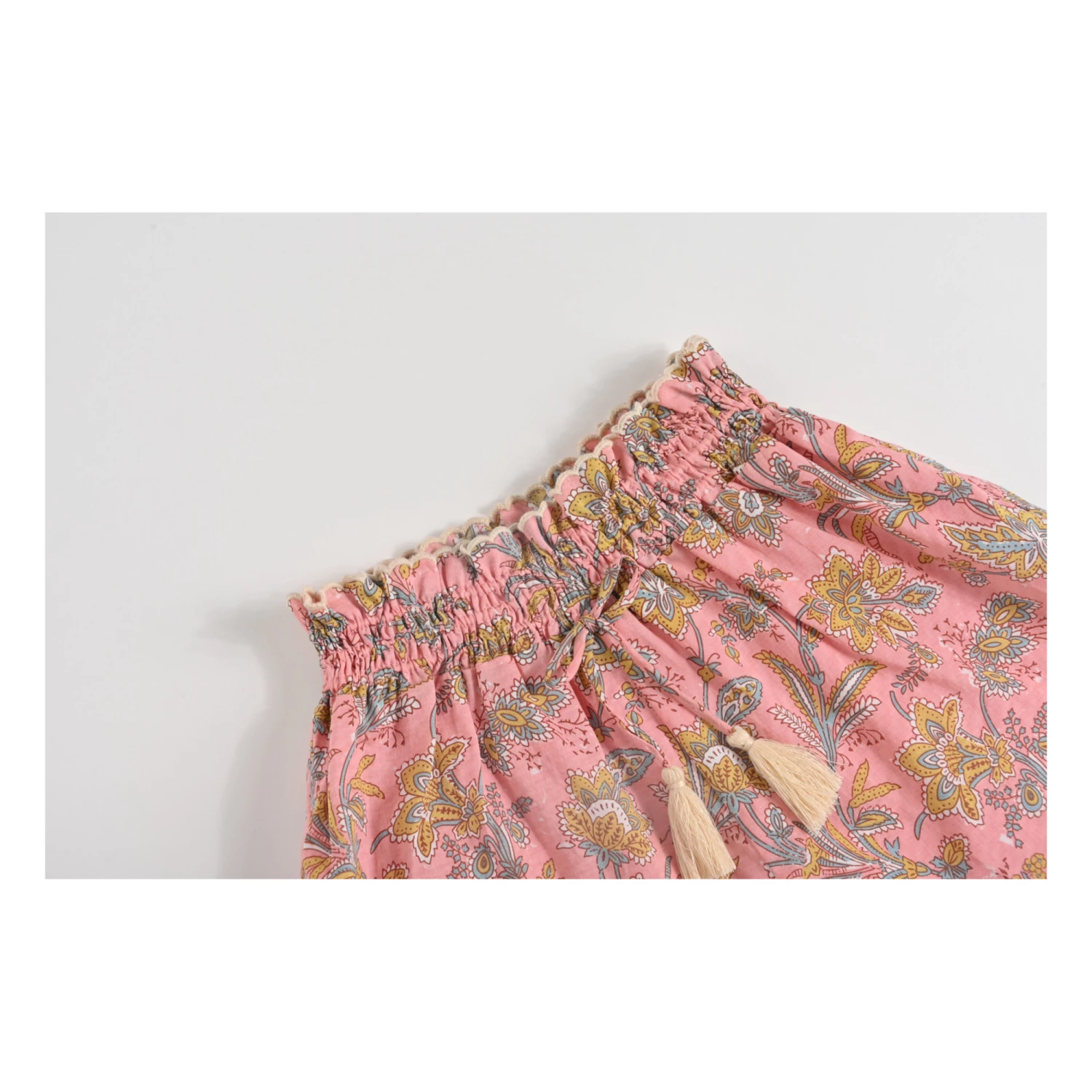 - Contrast stitching, Top stitched, Flowy, Drawstring(s), Scalloped edges, Pompom(s), Elasticated waist, Adjustable waist, Gathered at the waist, Embroidery