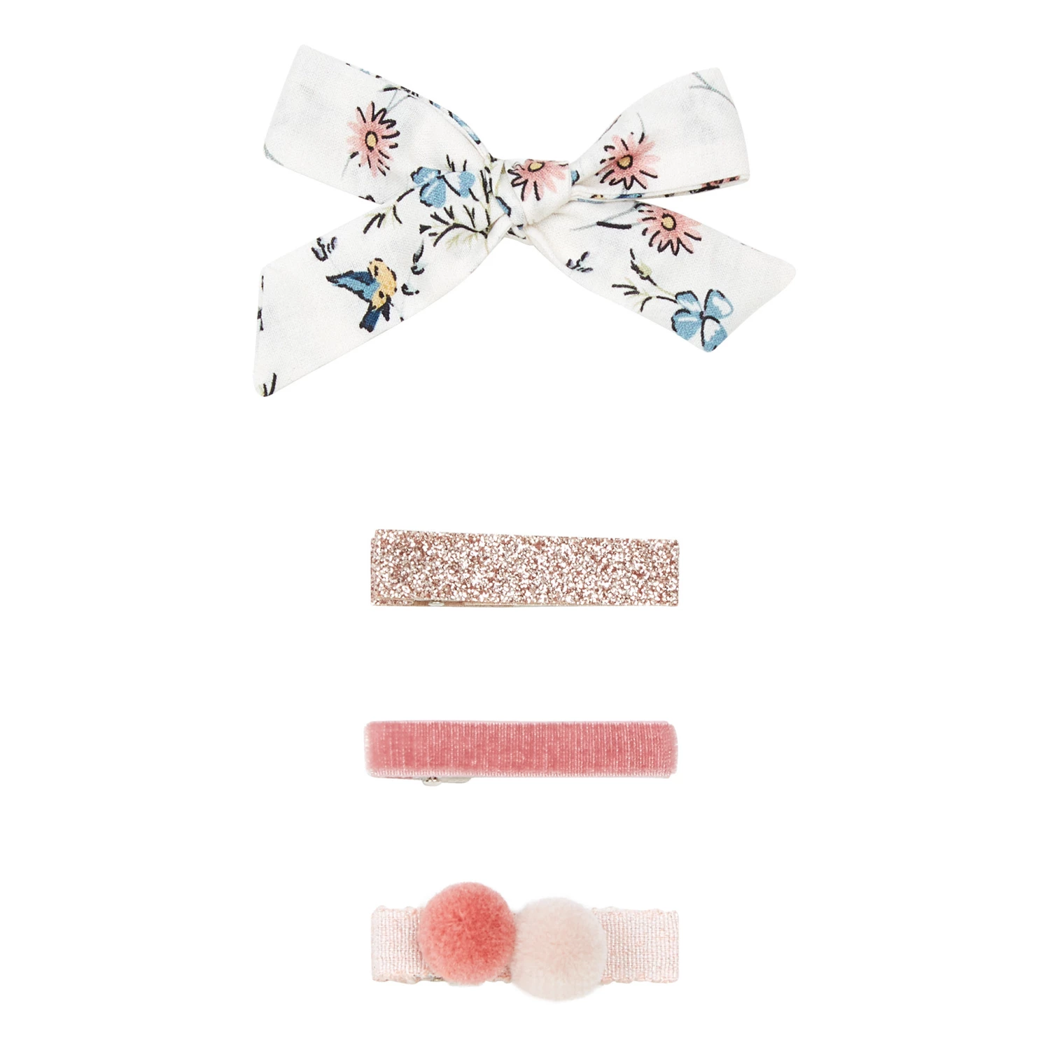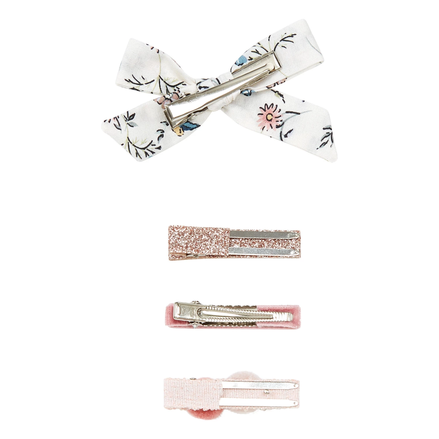 Each set includes: 1 small floral cotton bow clip, 1 velvet hair clip, 1 glitter hair clip and 1 pompom hair clip.