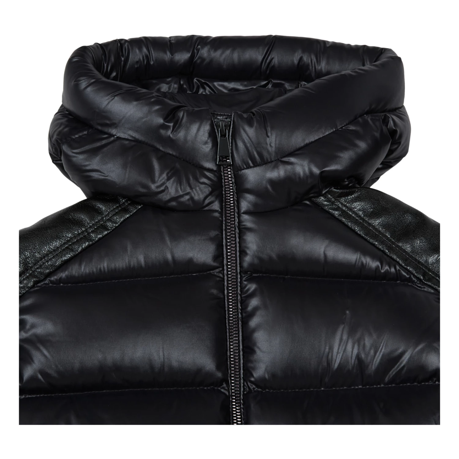 This model for girls is made of glossy lacquered nylon, with a feather filling and quilted padding that provide warmth and protection. Its elegant cut is defined by the elastic waistband and Moncler embroidery on the back. The wrap-around hood and zipped pockets further enhance the functionality of the garment.