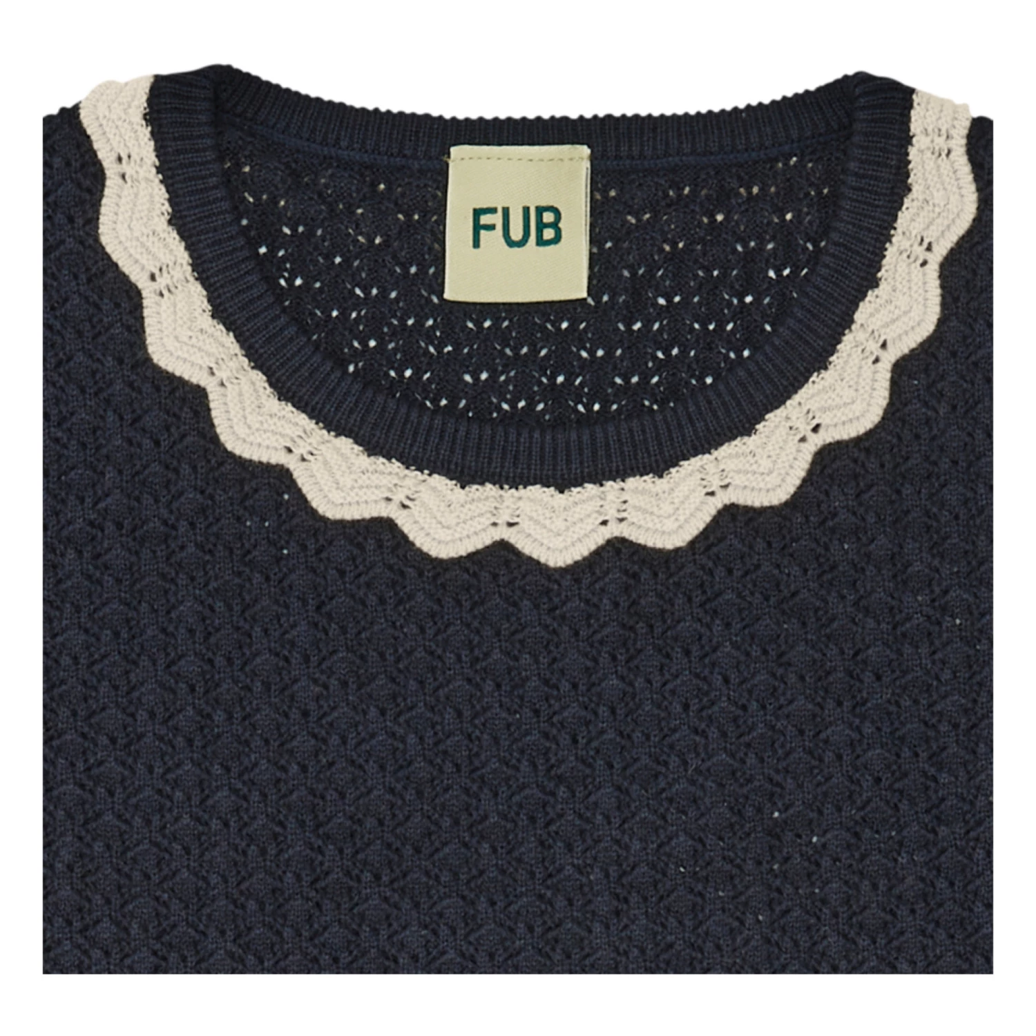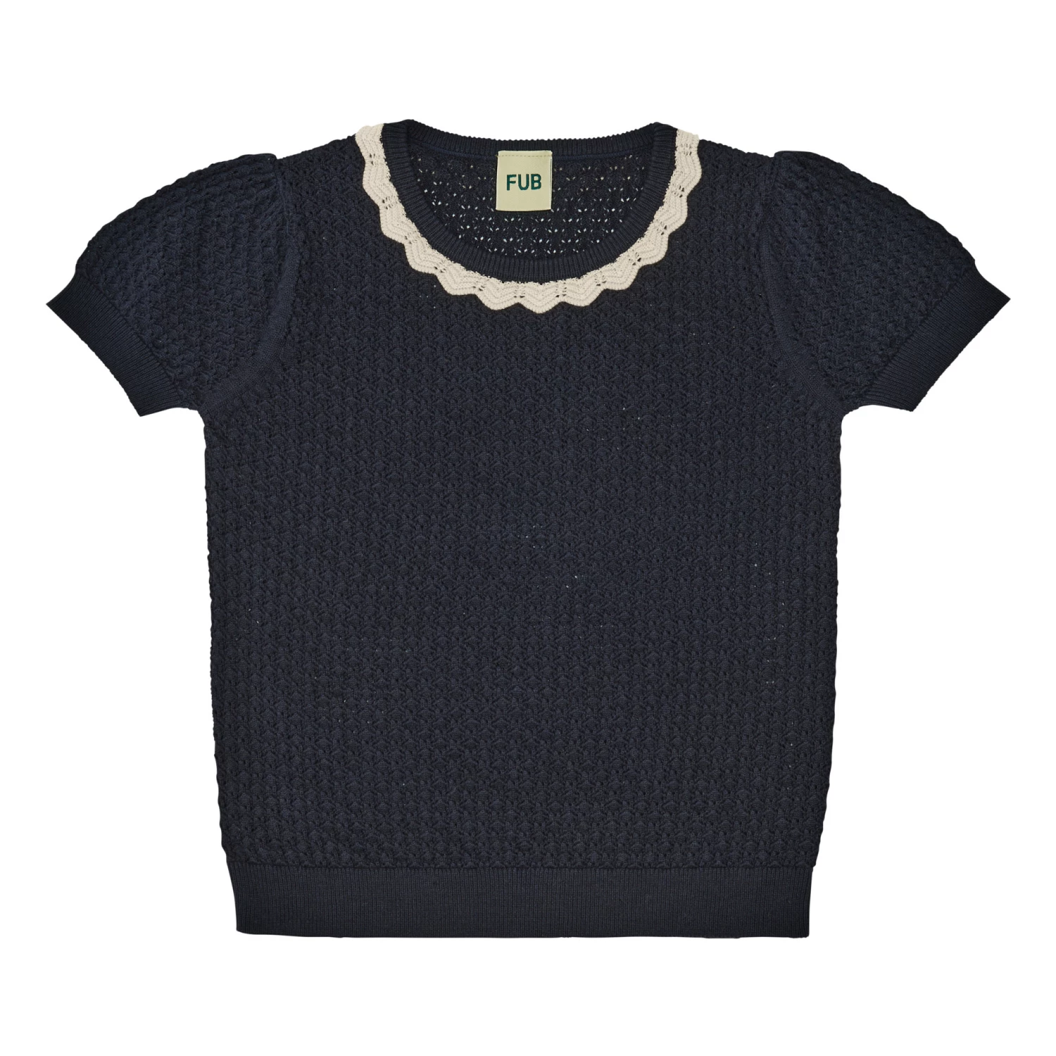 - Lace collar, Crew neck, Puff sleeves, Short sleeves, Decorative knit, Ribbed neckband