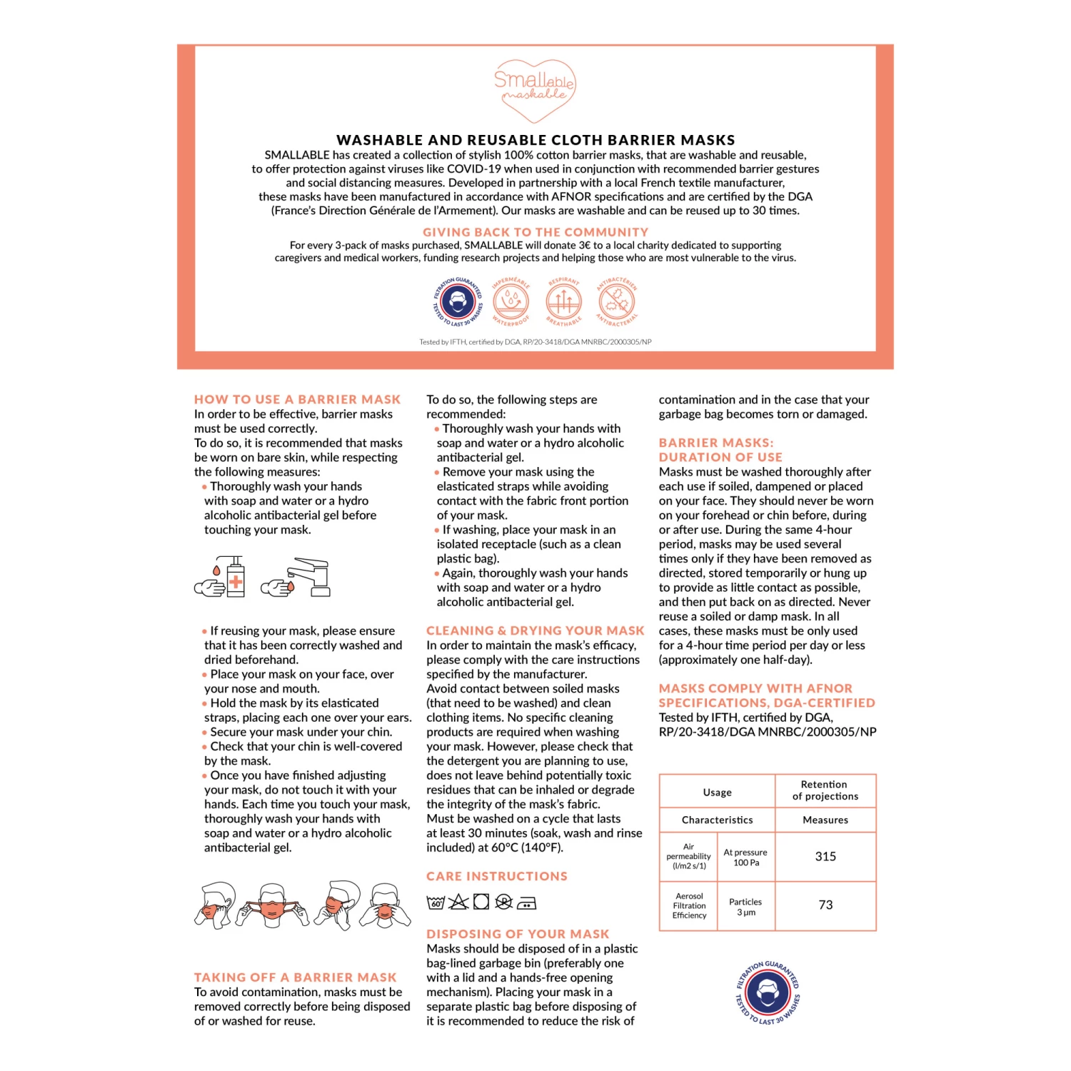 Developed in partnership with a local French textile manufacturer, these masks have been manufactured in accordance with AFNOR specifications and are certified by the DGA (France’s Direction Générale de l’Armement – guaranteed filtration, tested to last up to 30 washes, resistant, anti-bacterial and breathable). Our masks are washable and can be reused up to 30 times.