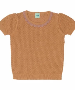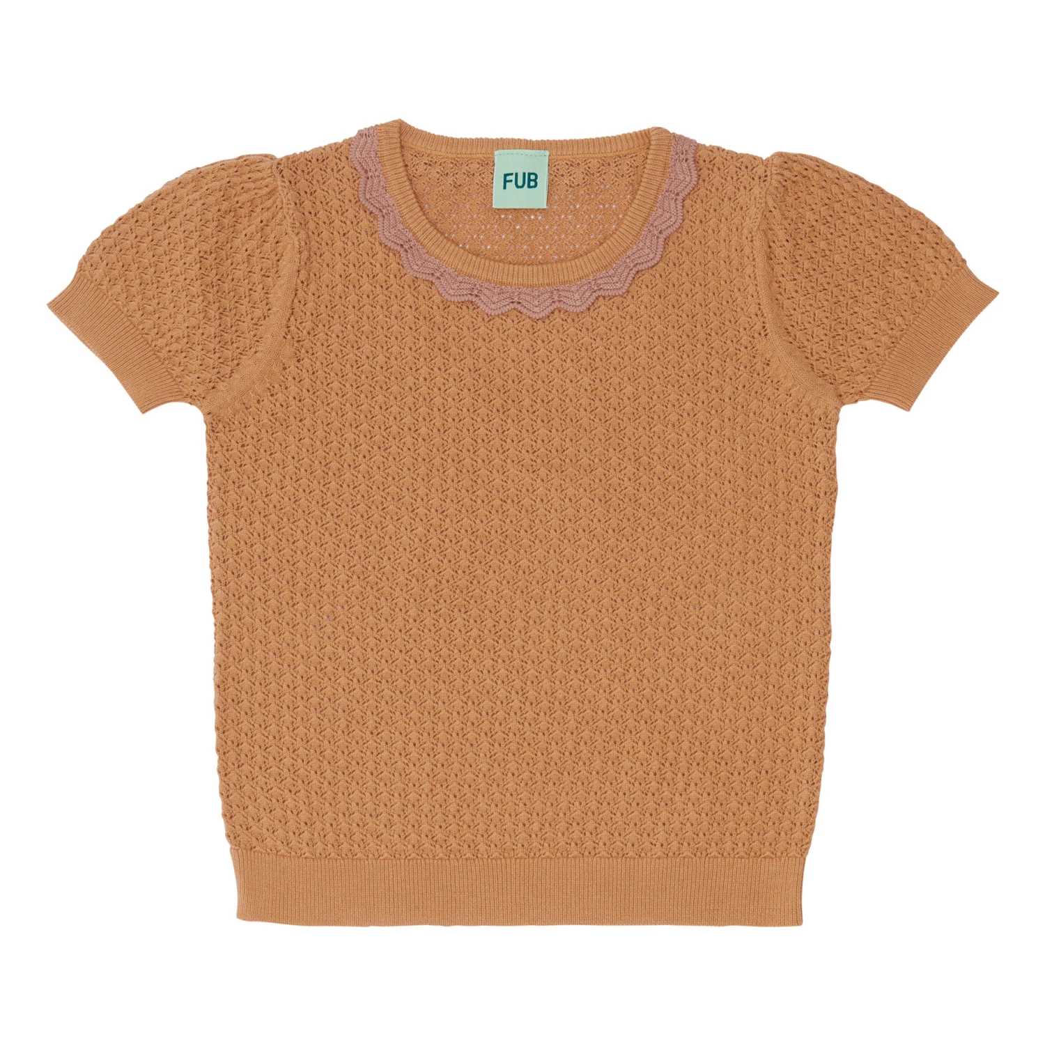 - Lace collar, Crew neck, Puff sleeves, Short sleeves, Decorative knit, Ribbed neckband