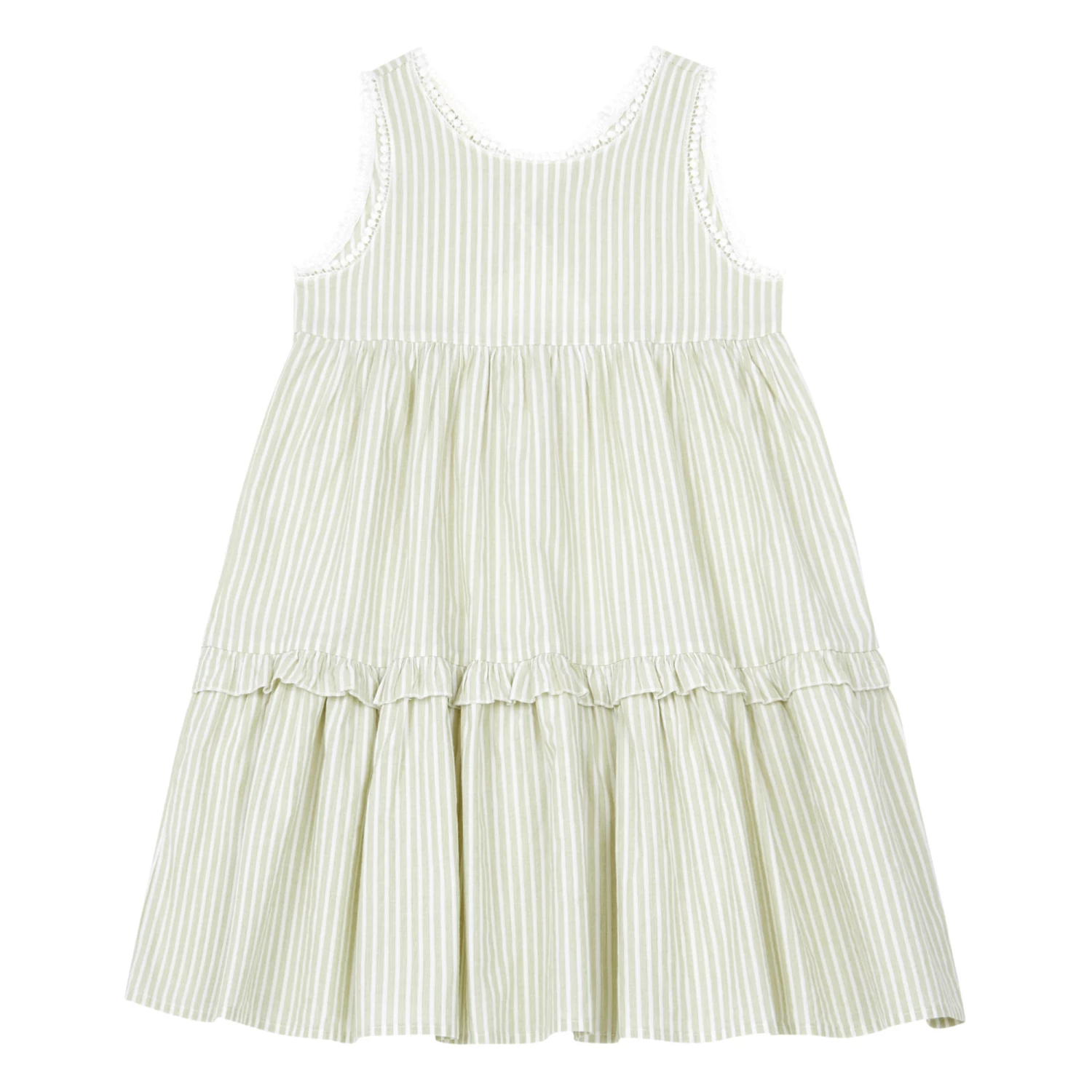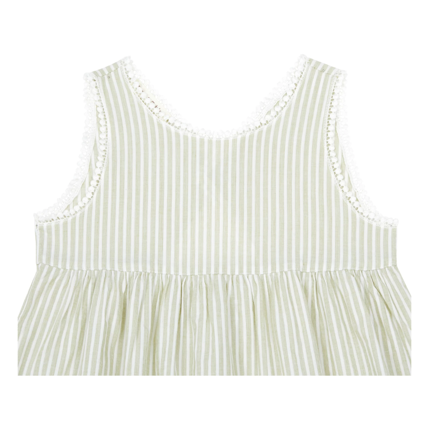 - Overlocked hem finish, Low-cut back, Elastic at back, Crew neck, Decorative edges, Frilled edges