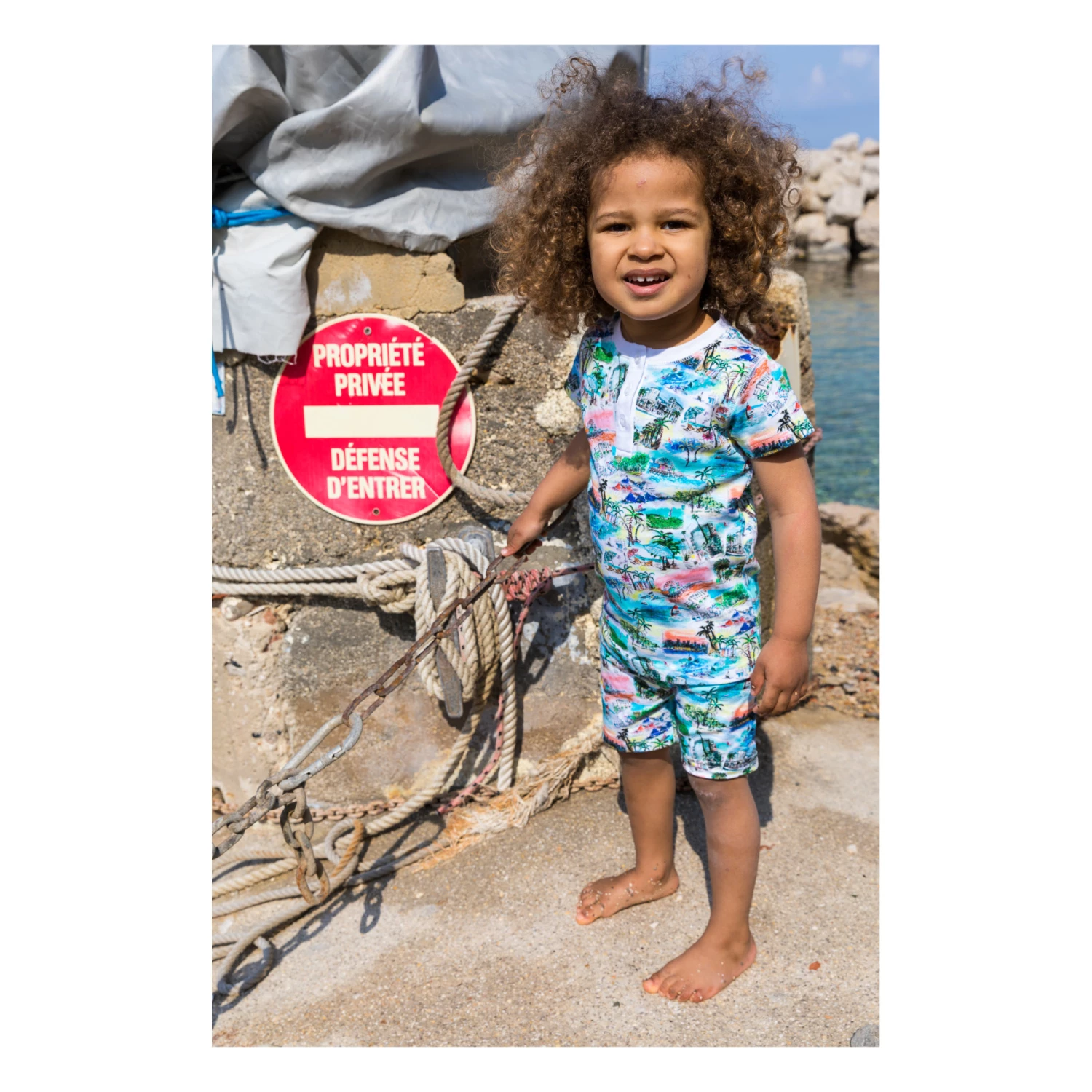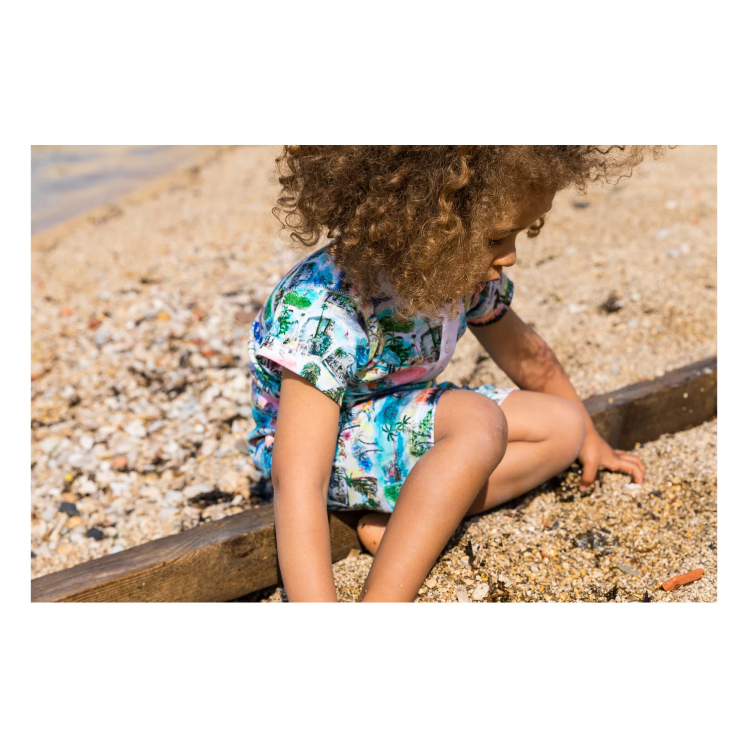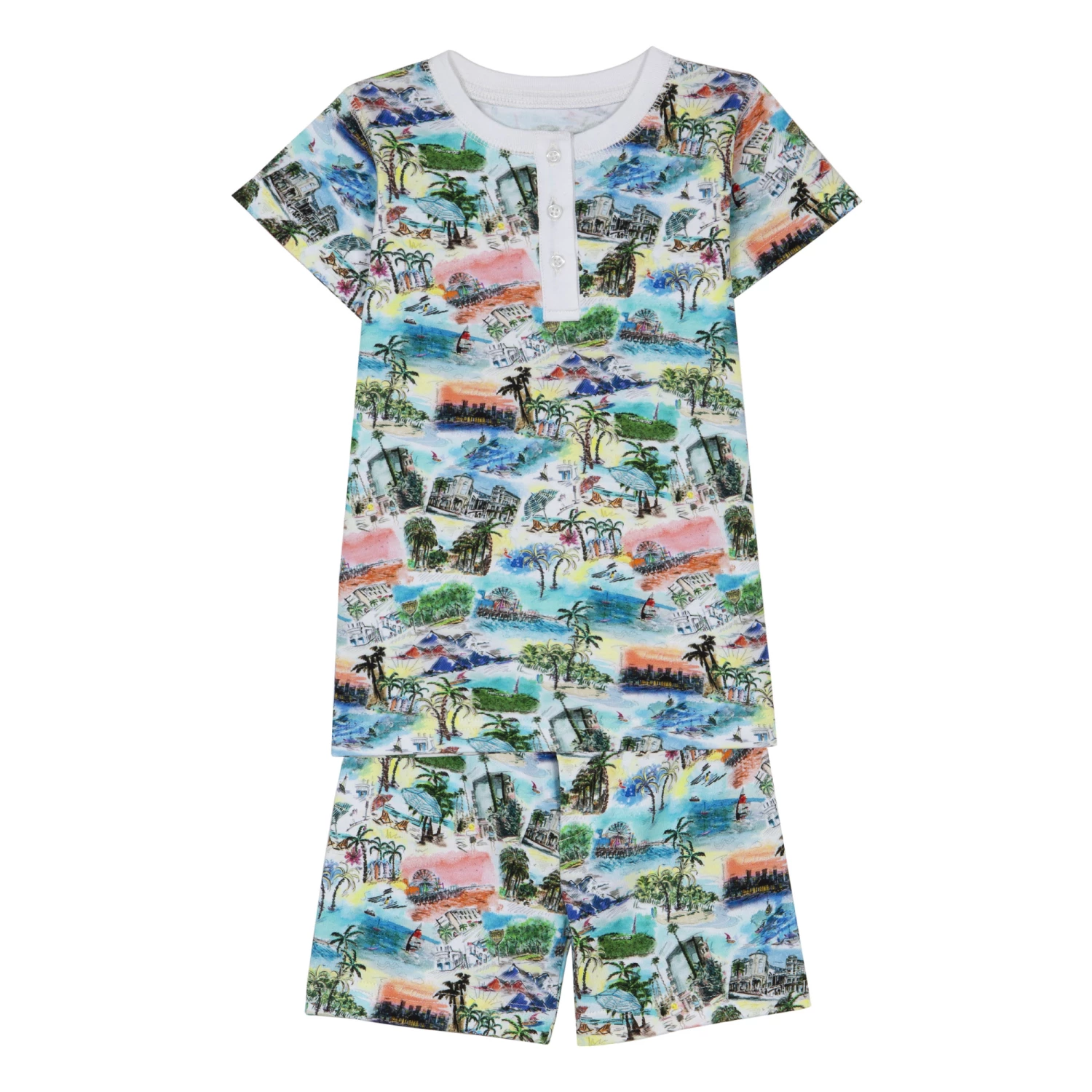 - Details : Palm tree print, Round Neck, Short sleeves, Elastic waist, Buttons on front, 2-piece ensemble, – Comfortable