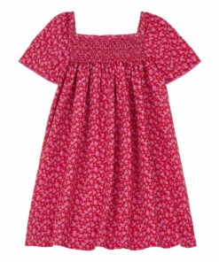 - Overlocked hem finish, Ruffle front, Smocked, Gathered at the back, Square neck, Short sleeves, Top stitched edges, Gathered at shoulders