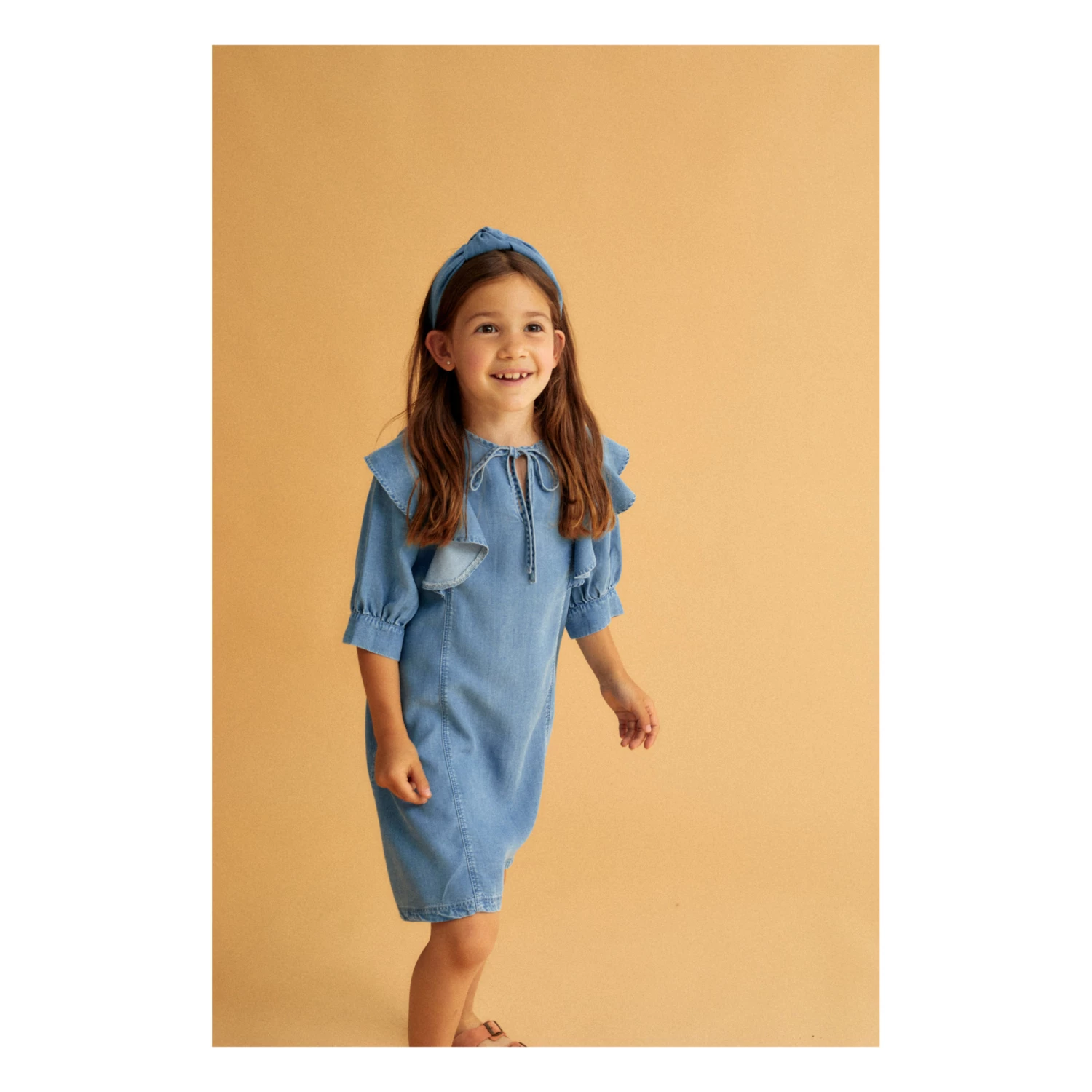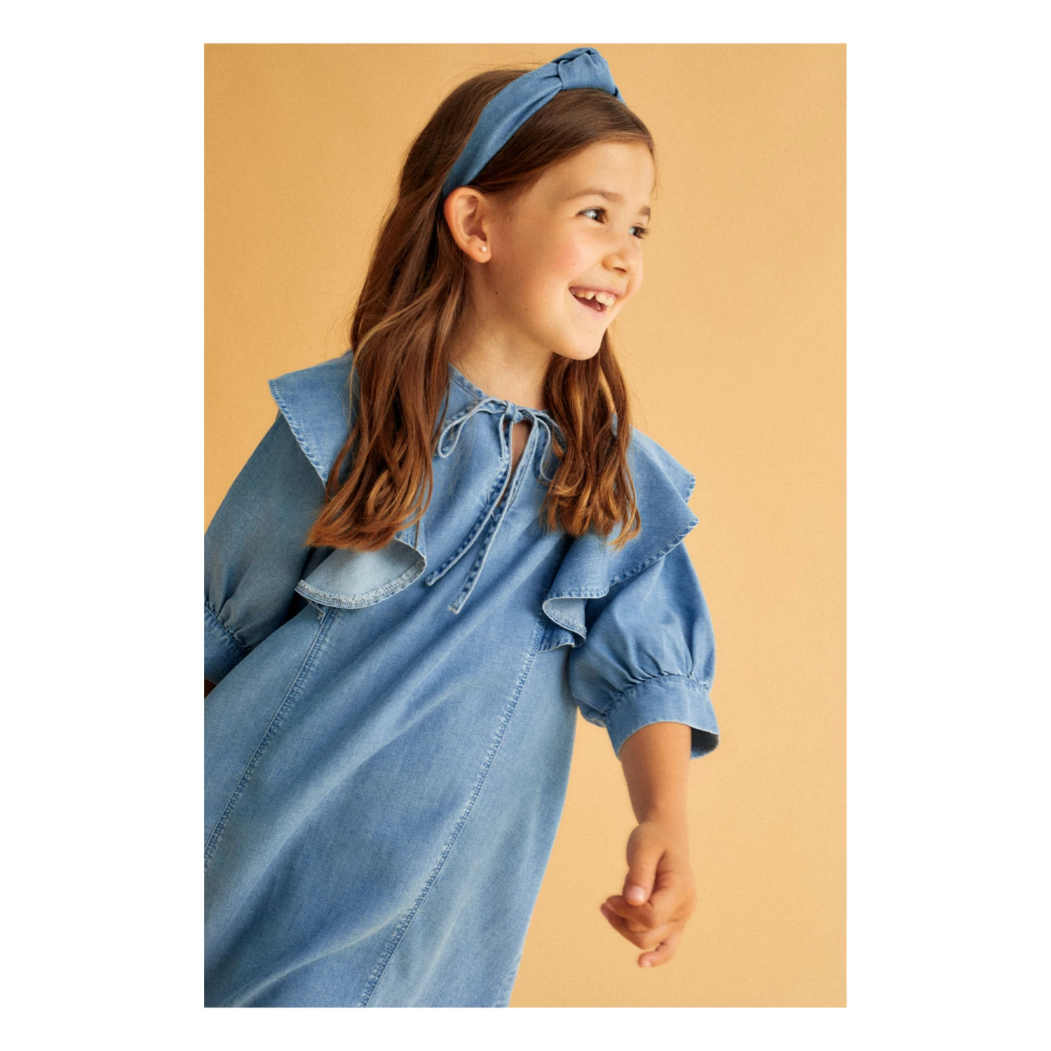 - Contrast stitching, Frilled yoke, Crew neck, Top stitched, Tie(s) at neckline, Balloon sleeves, Short sleeves, Pleated