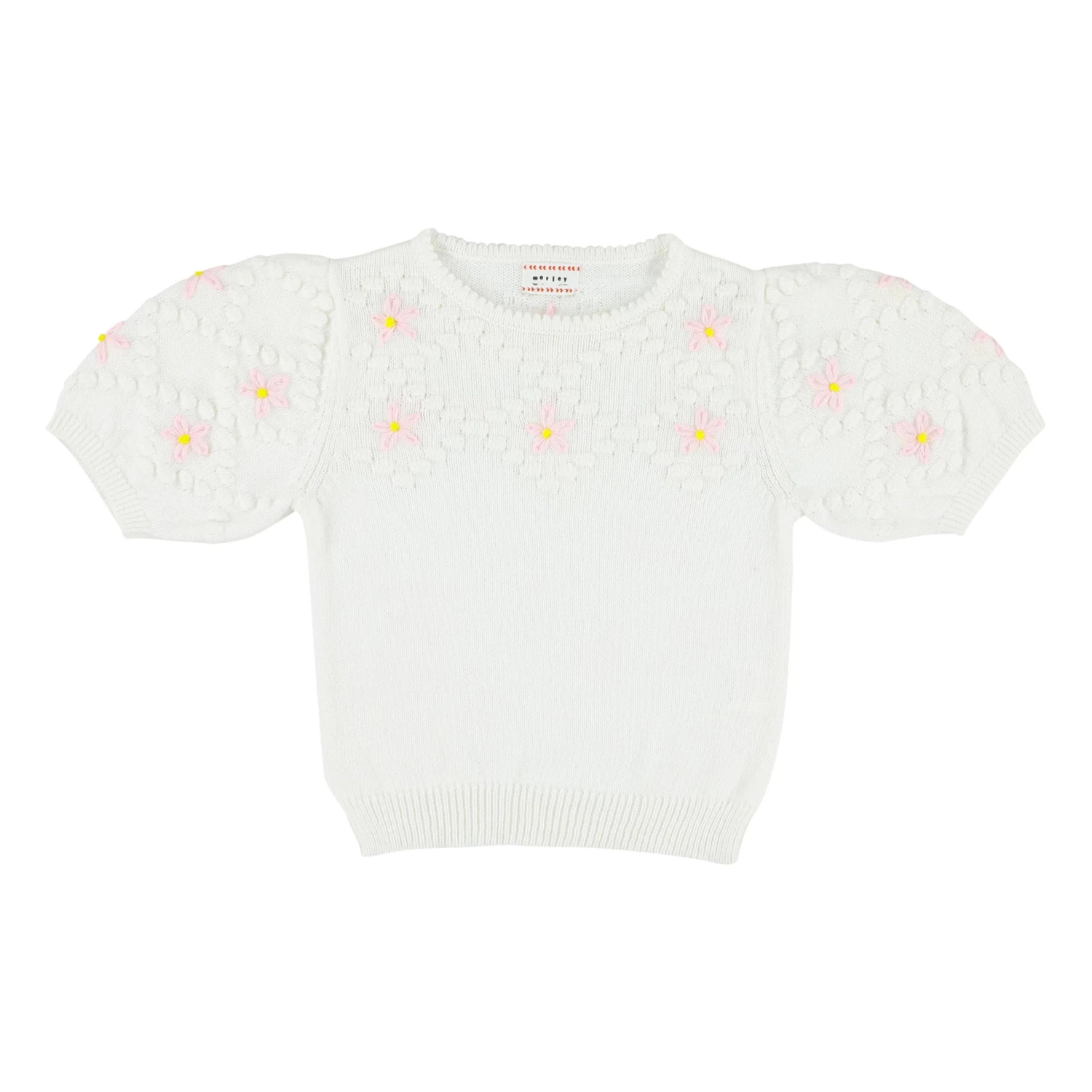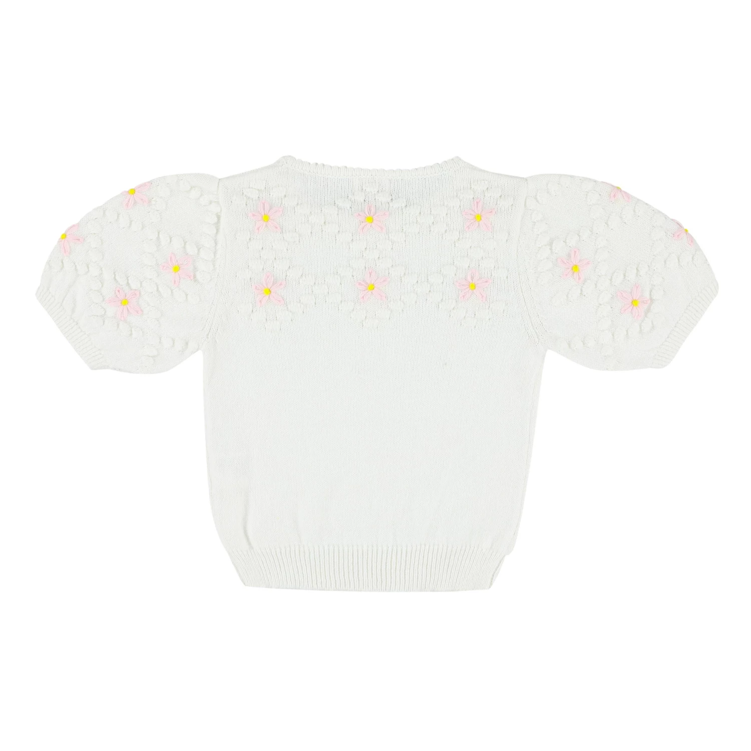 - Chain stitch embroidery, Crew neck, Picot finish, Balloon sleeves, Short sleeves, Ribbed cuffs, Ribbed edges