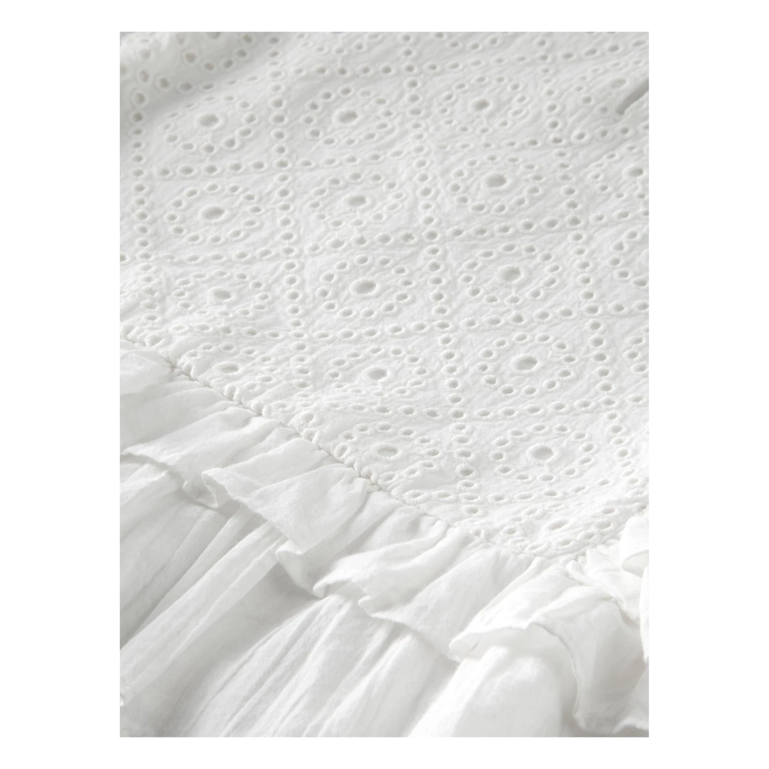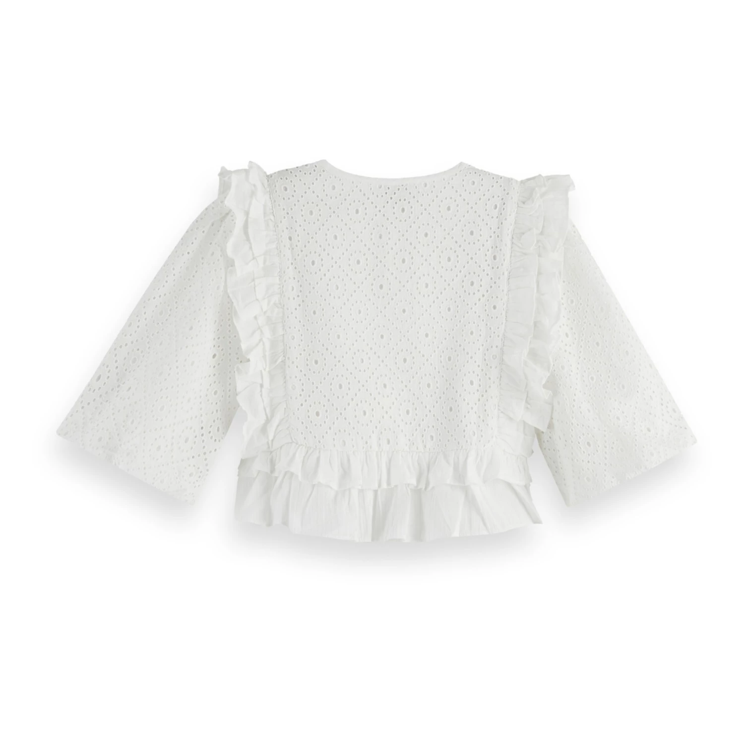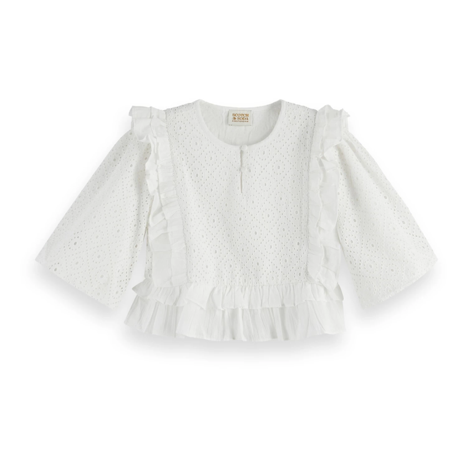 - Lined, Gathered armholes, Frilled yoke, Crew neck, Short sleeves, Wide sleeves, Openwork, Embroidery