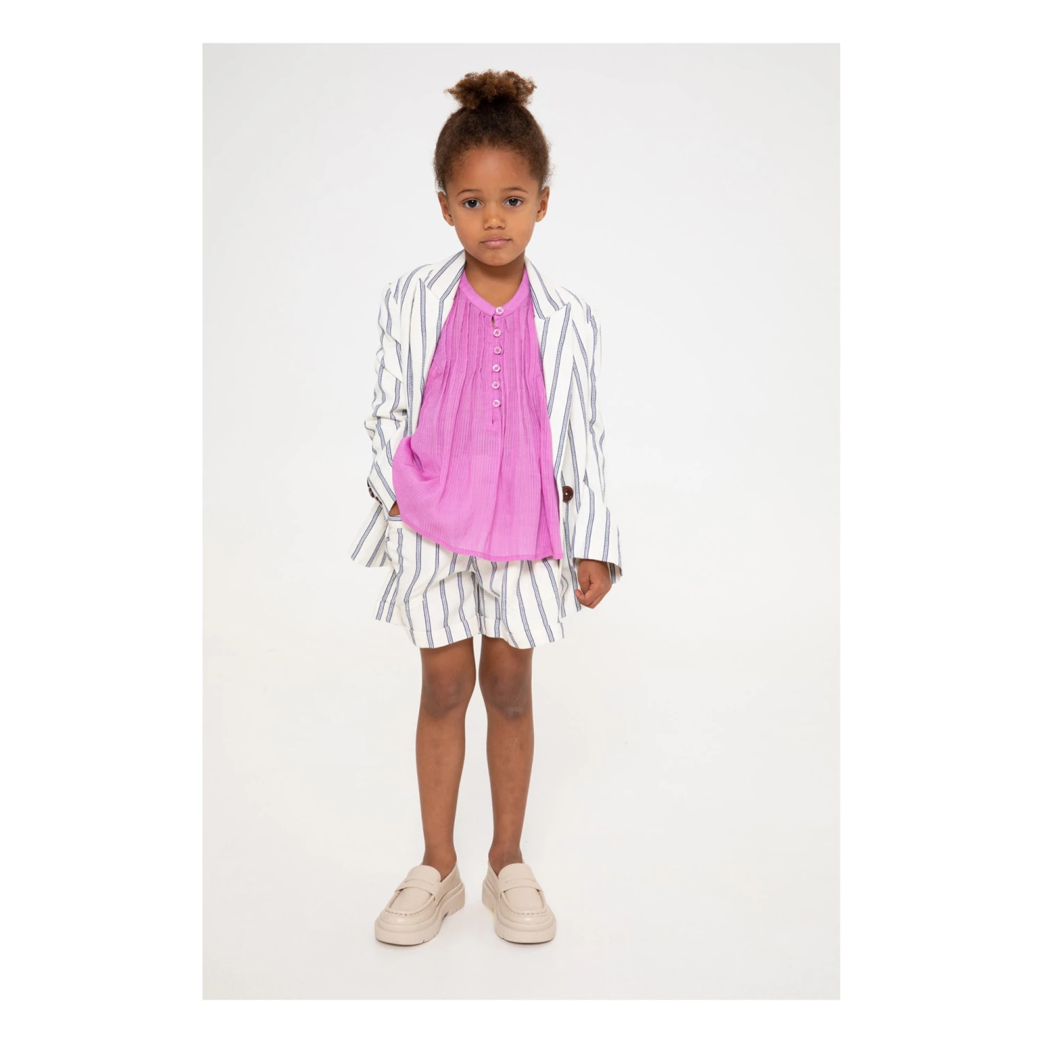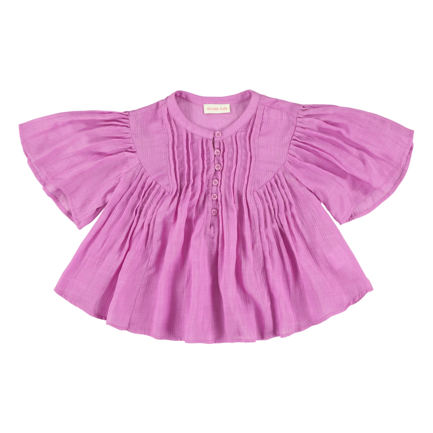 - Crew neck, Flowy, Short sleeves, Butterfly sleeves, Pleated sleeves, Pleated shirtfront, Knife pleat(s)