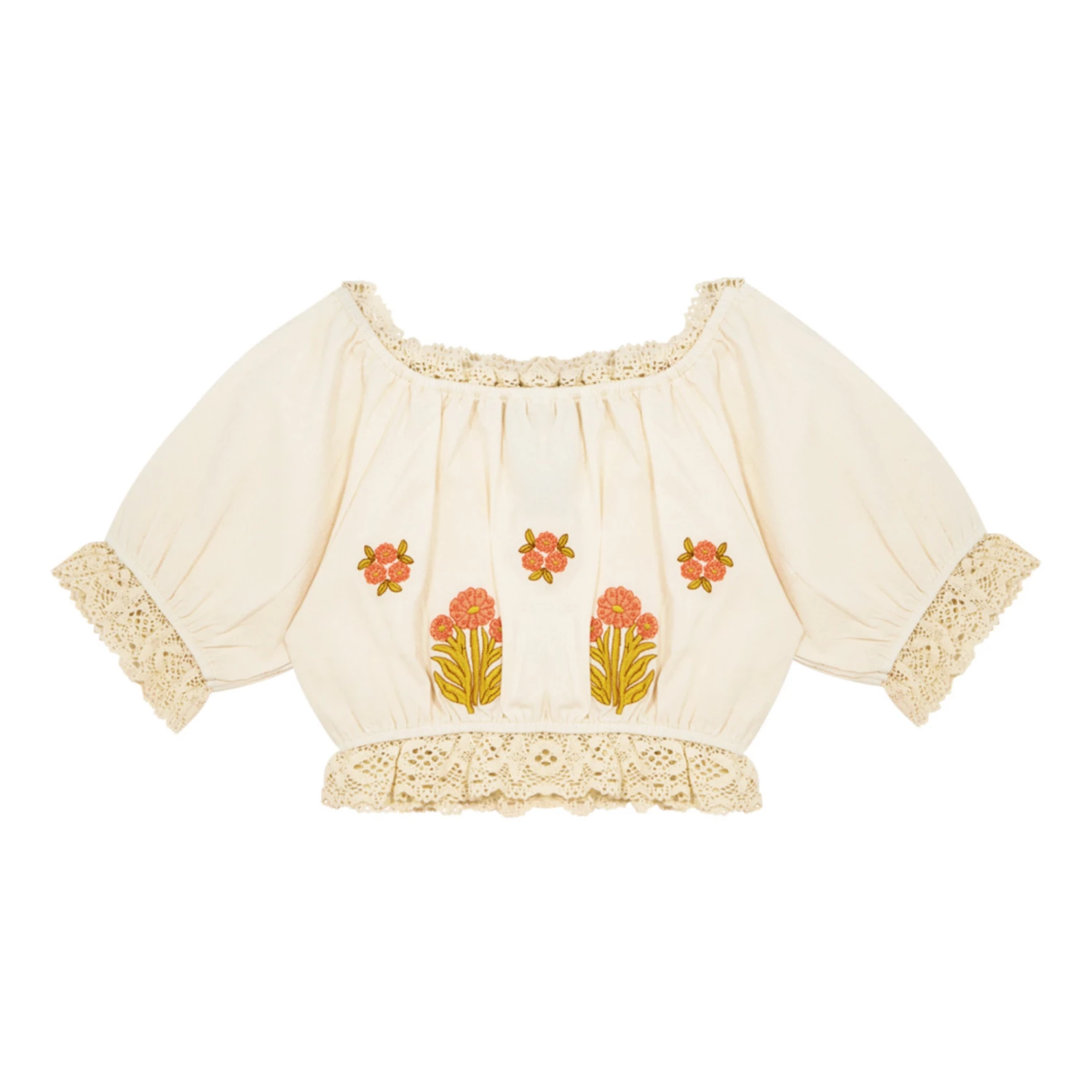 - Contrast stitching, Square neck, Short sleeves, Frilled edges, Pleated, Embroidery