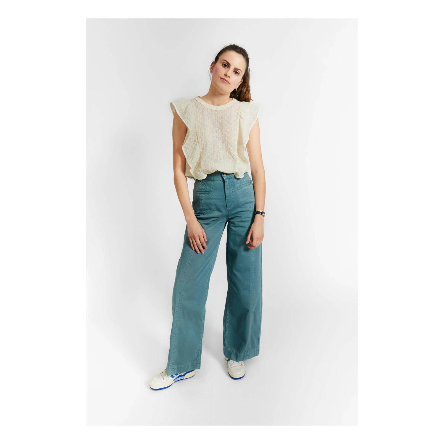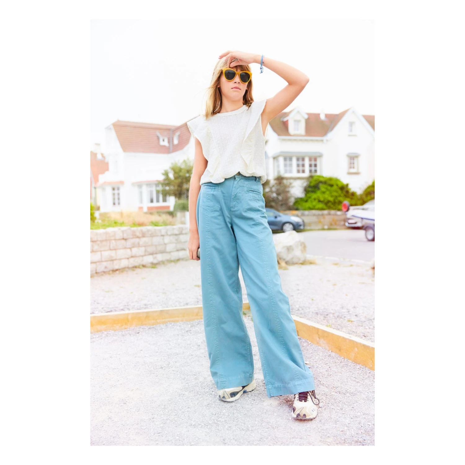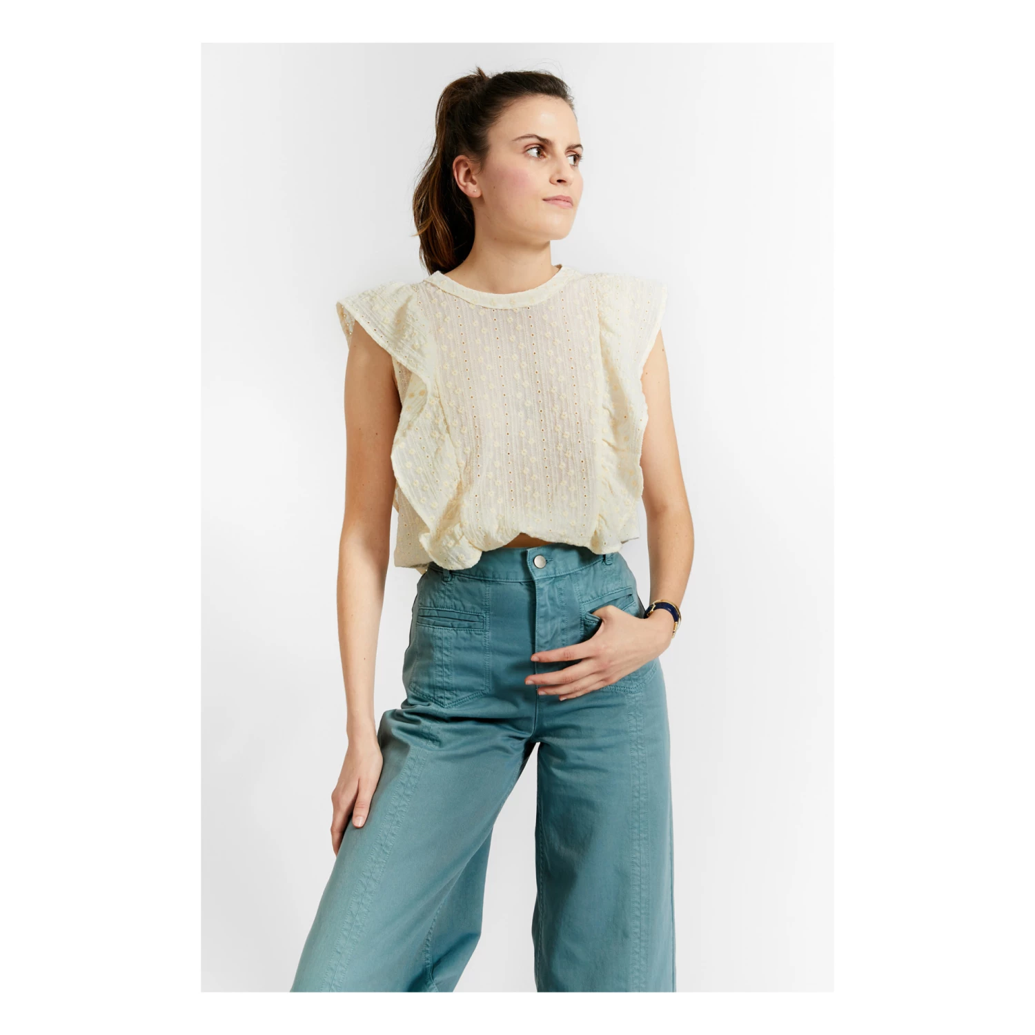 - Frilled yoke, Crew neck, Lightweight and comfortable, Slightly transparent, Sleeveless, Elasticated waist, Openwork, Embroidery