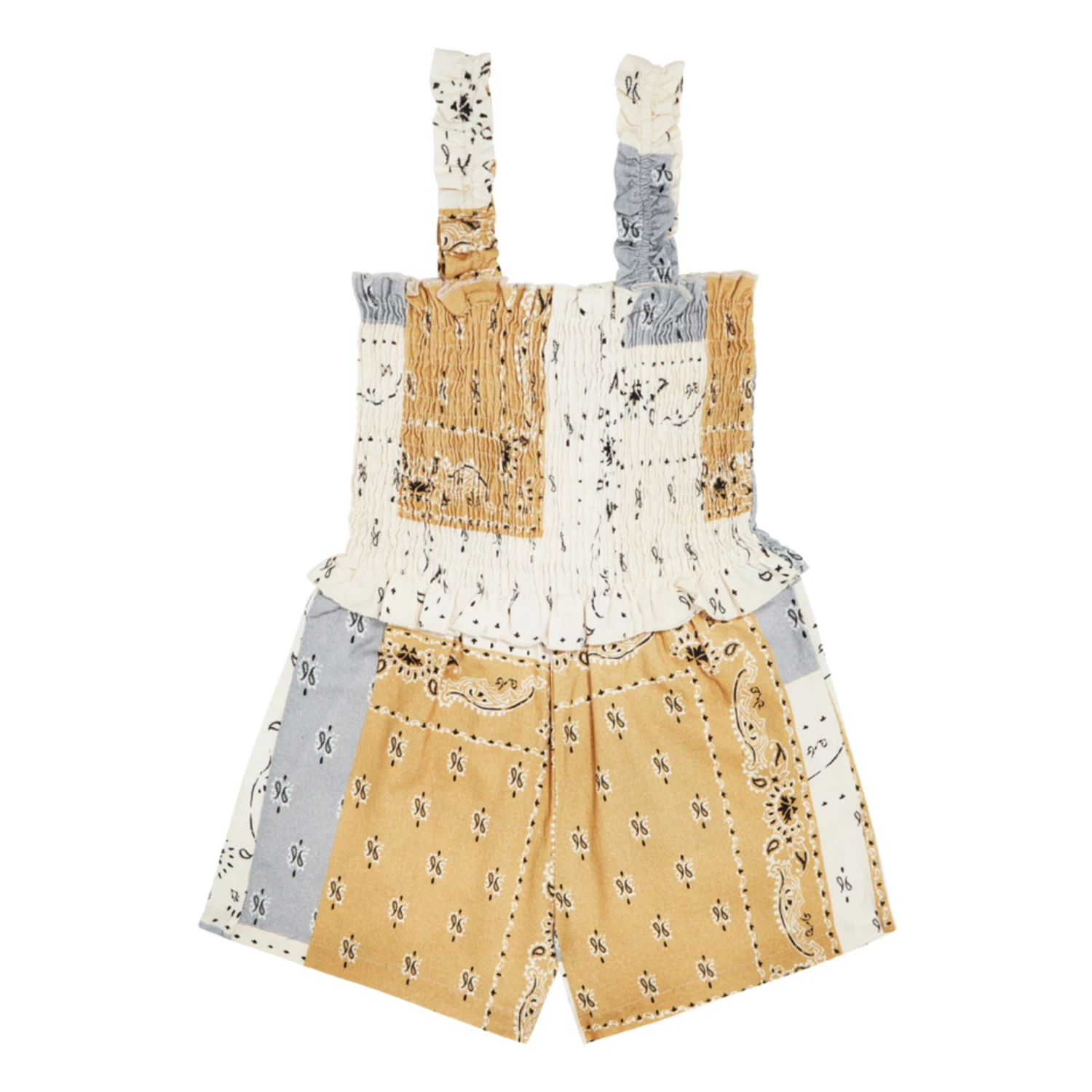 - Top stitched, Frilled edges, Gathered at the waist, Elastic straps