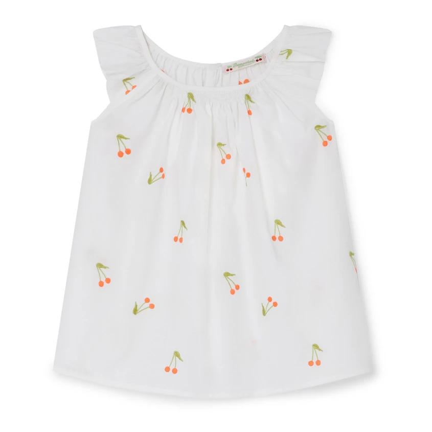 - Garment pulls on, Button(s) on the back, Fruit print
