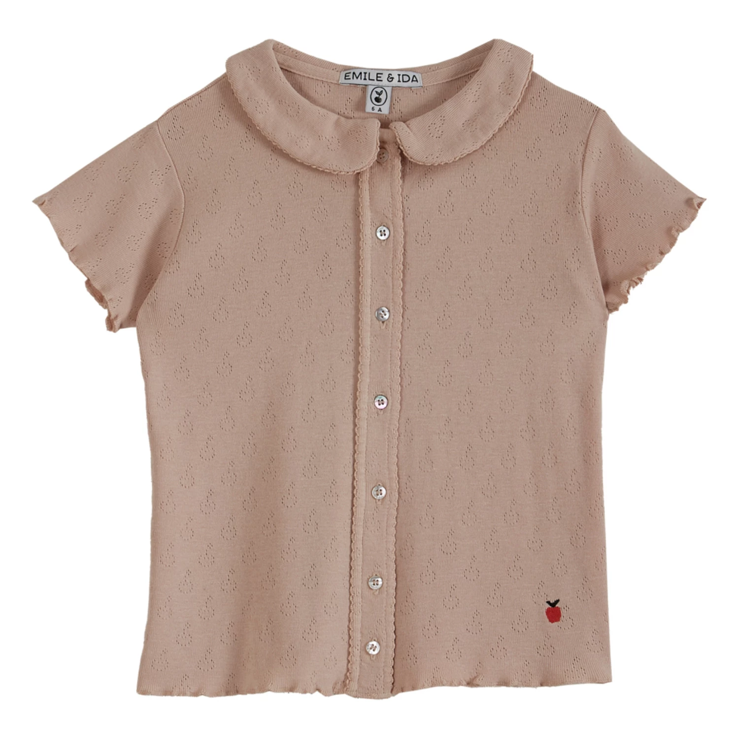 - Flowy, Short sleeves, Rolled hem, Openwork, Embroidery, Peter Pan collar