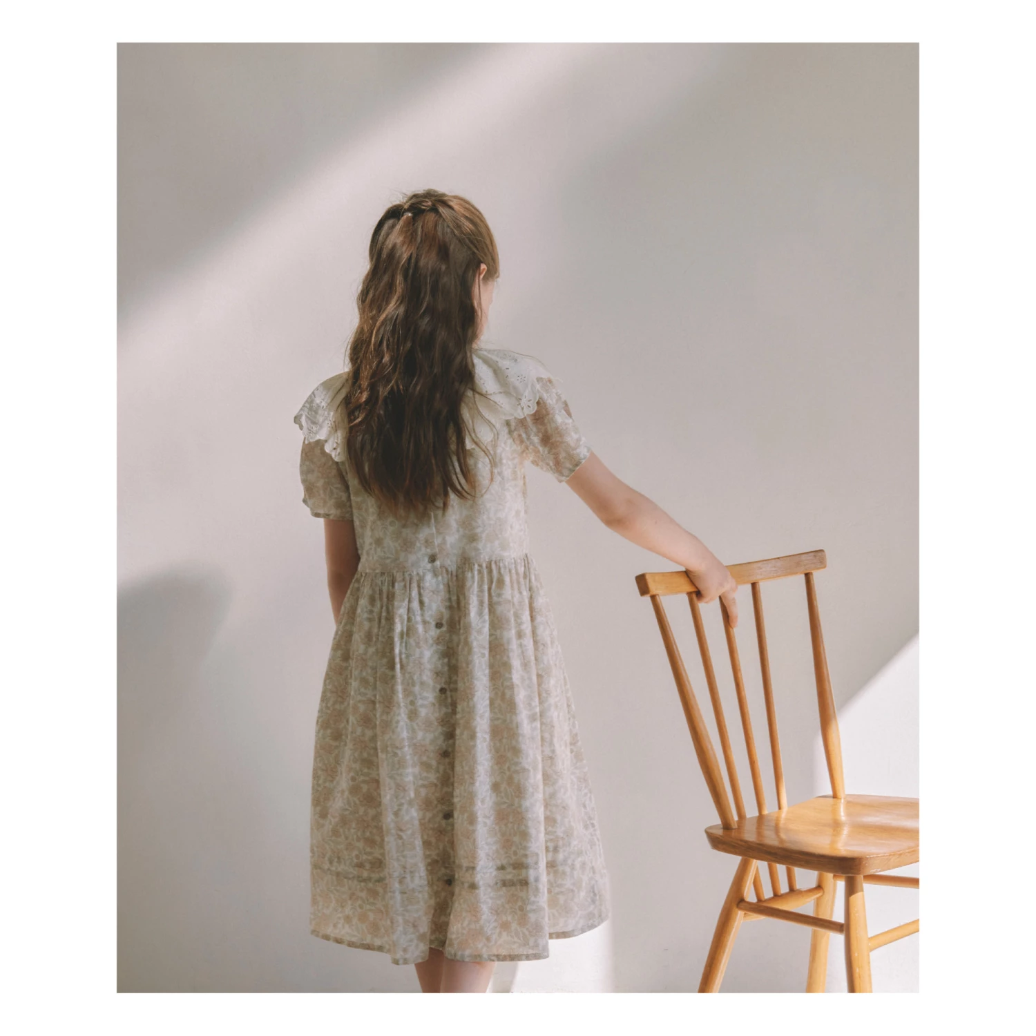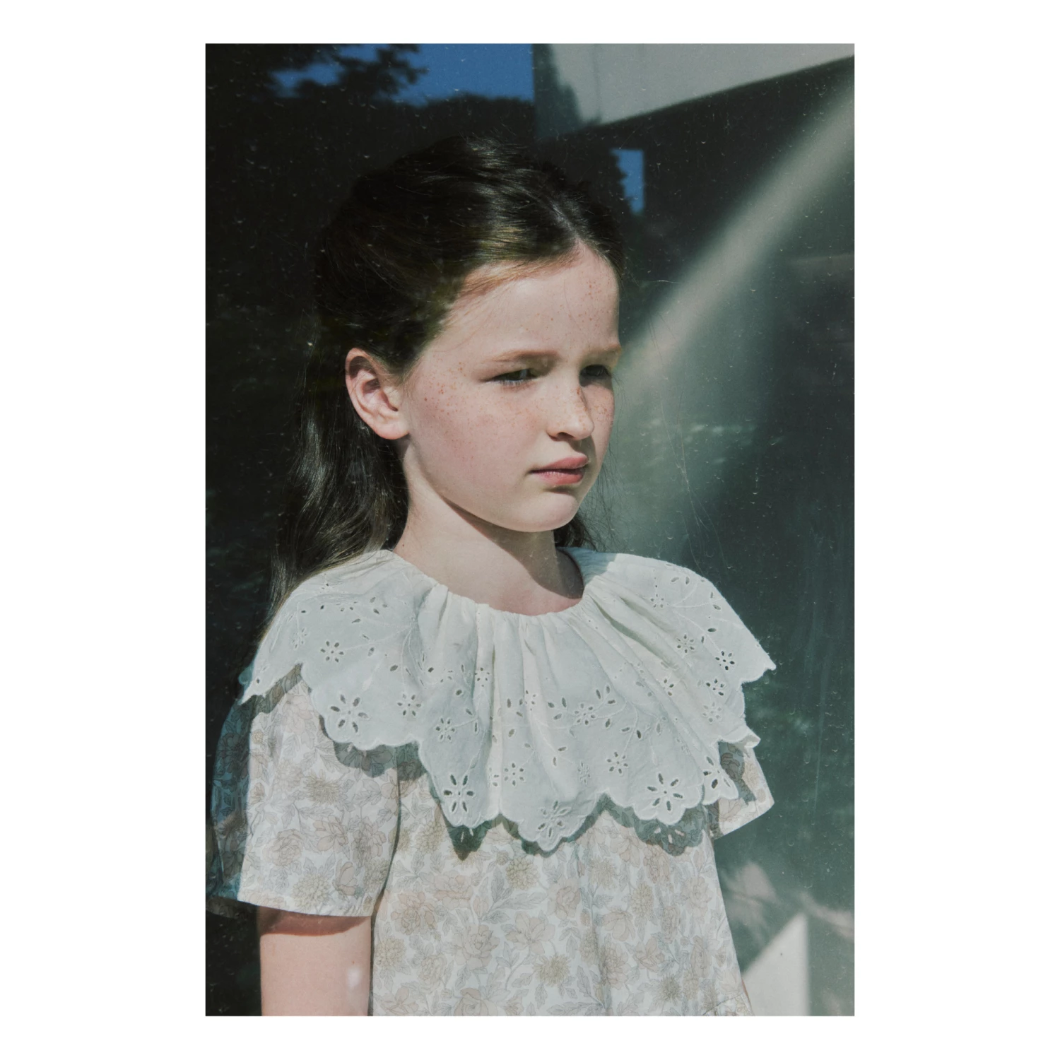 - Crew neck, Top stitched, Puff sleeves, Short sleeves, Elasticated waist, Pleated, Embroidery, Ruff collar